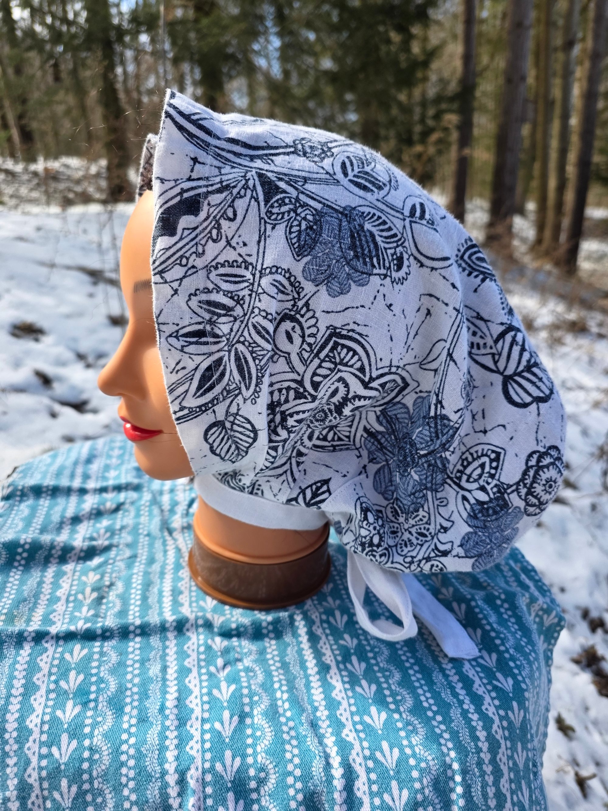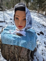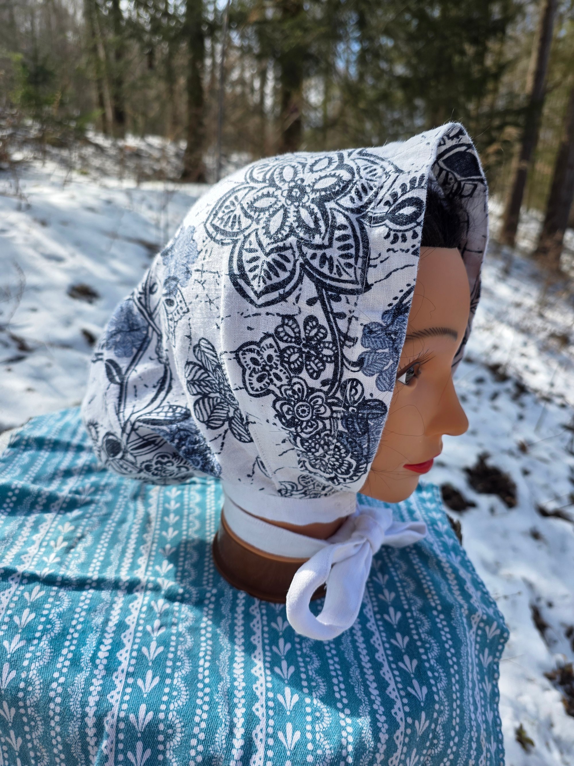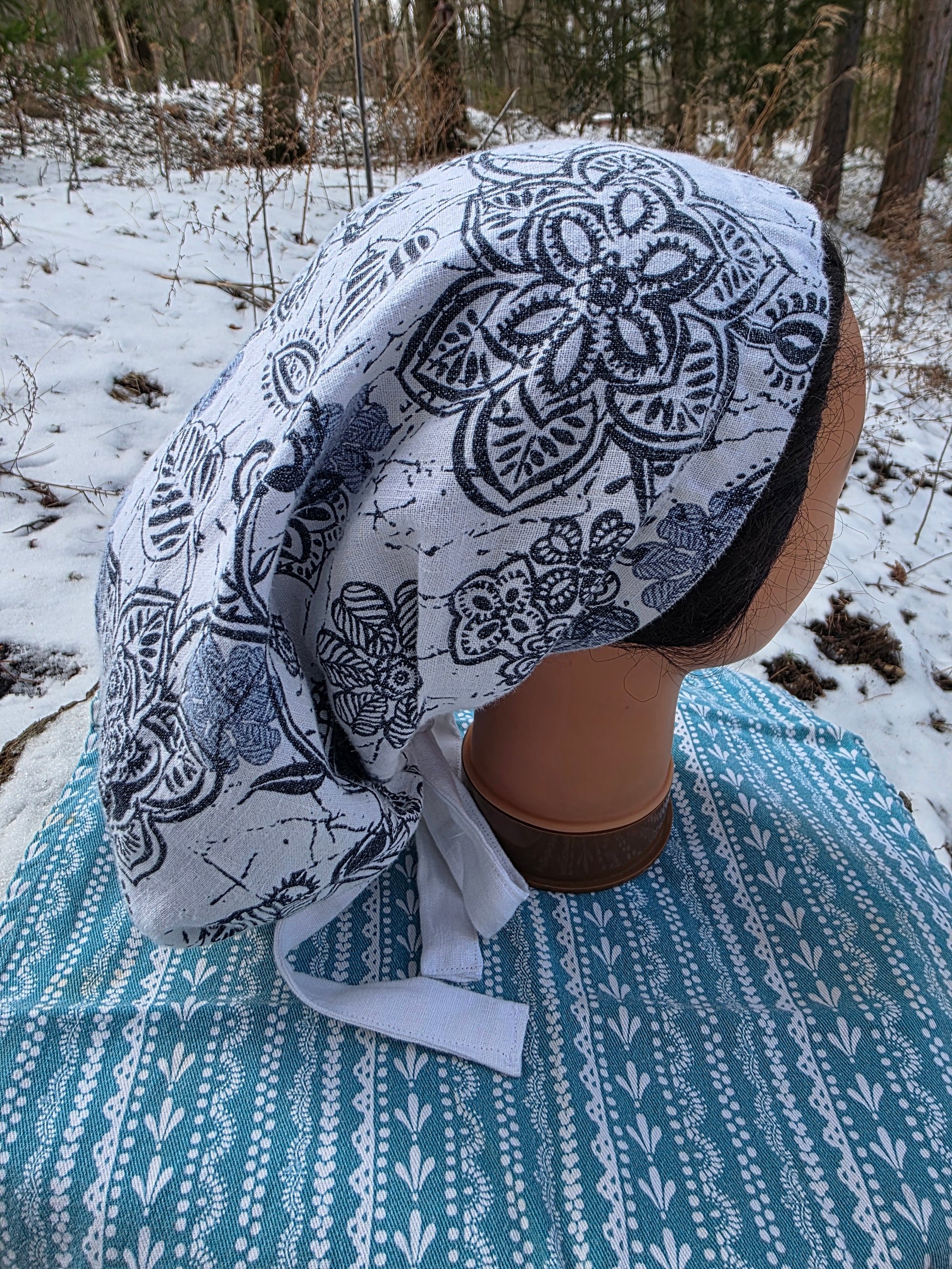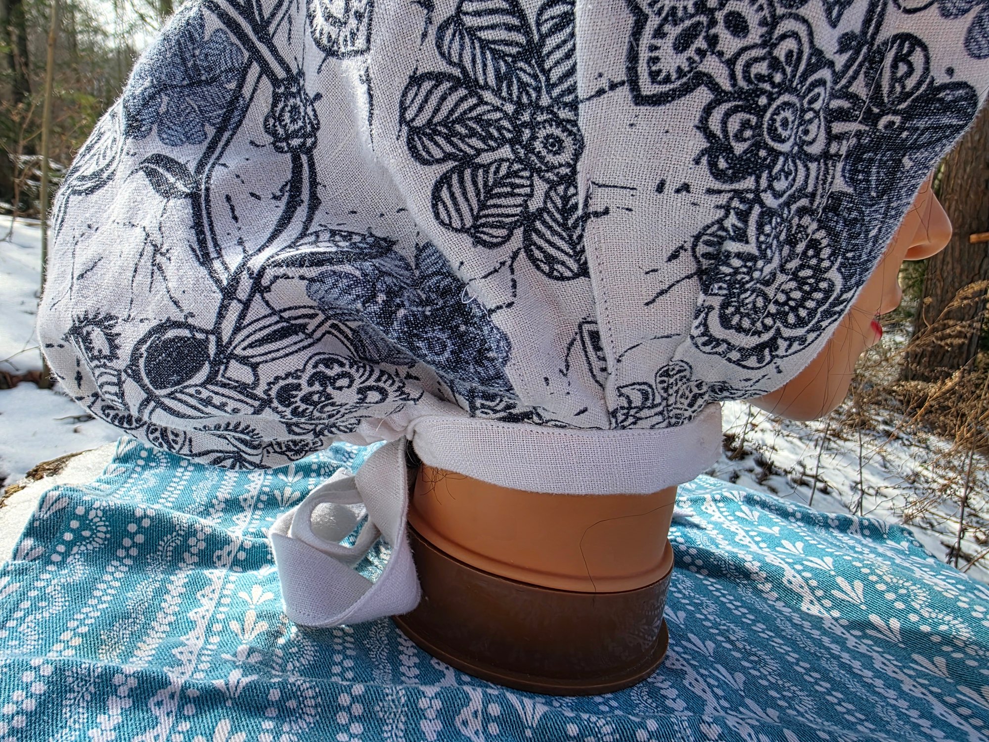 5 Option Bonnet Snood in Upcycled Linen- Navy Floral- Small/Medium