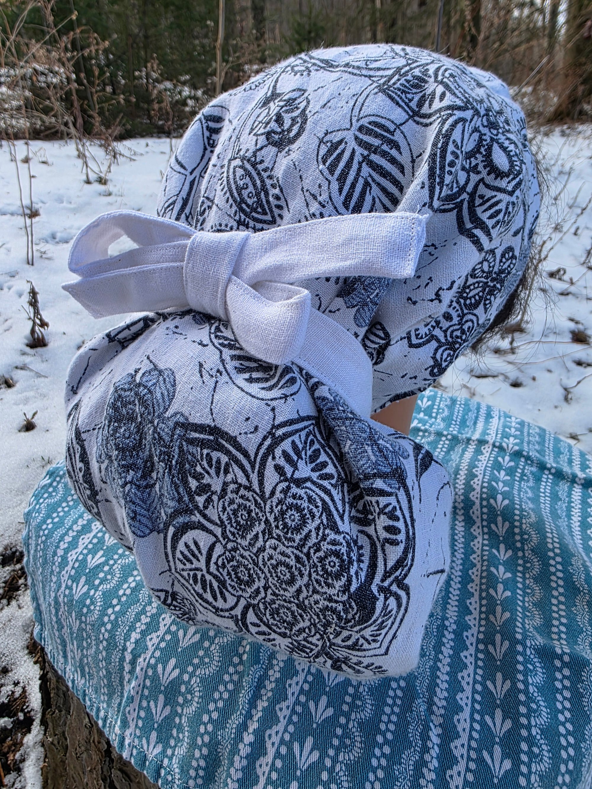 Made from 100% linen upcycled garments, this Bonnet Snood features a covered elastic gathered pouch for your hair, a hand sewn stainless steel clasp that will fasten either at your neck nape or under your chin. The generous ties allow you to be creative in how you anchor and present your finished style.