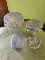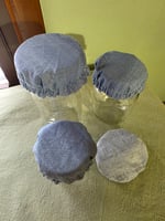Set of 4 Reversible jar covers that fit both regular and wide mouth canning jars, made from certified organic 100% cotton fabrics.