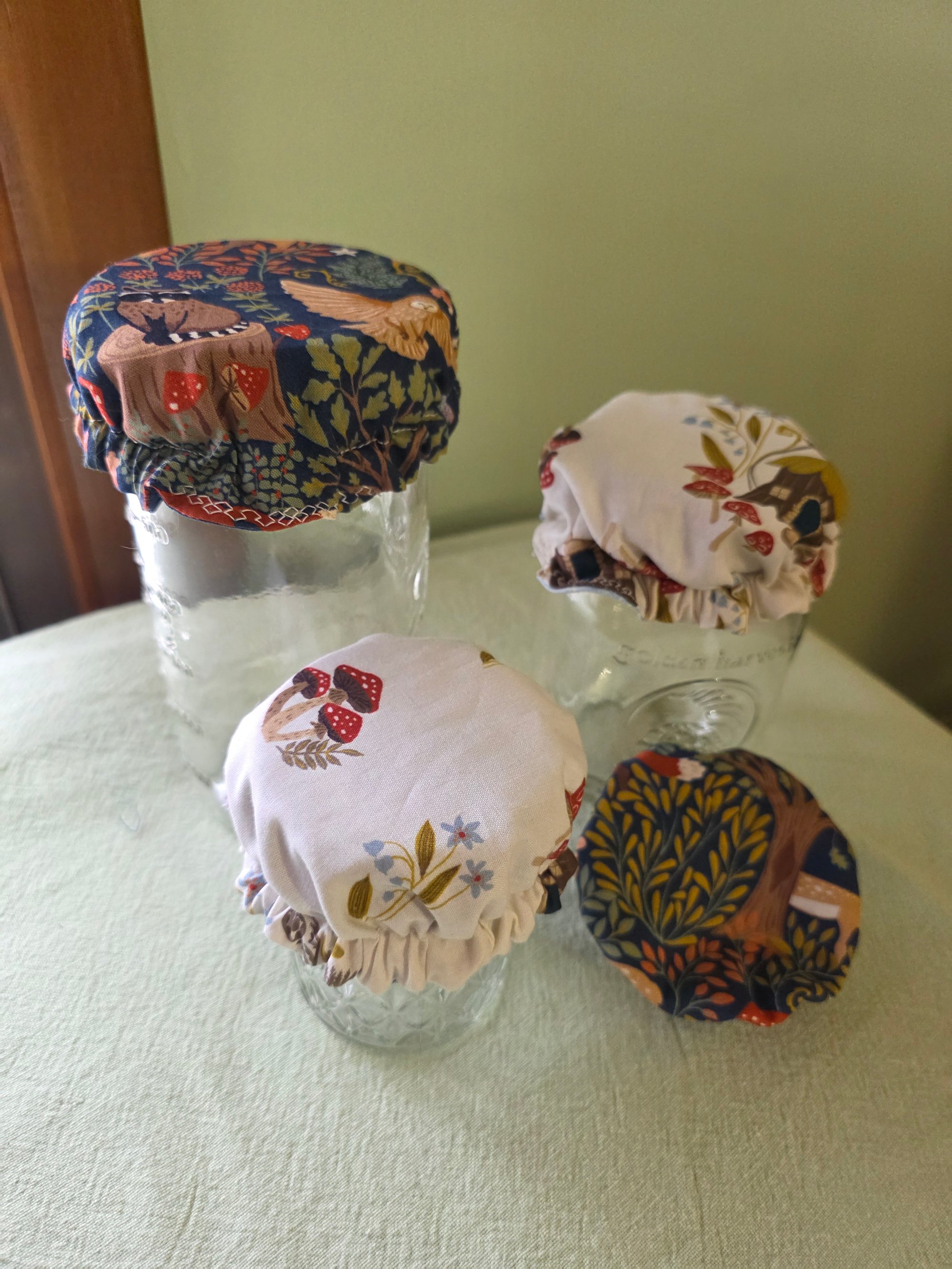 Set of 4 reversible jar coverd is made from Certified Organic 100% Cotton Fabric and fits both regular and wide mouth jars