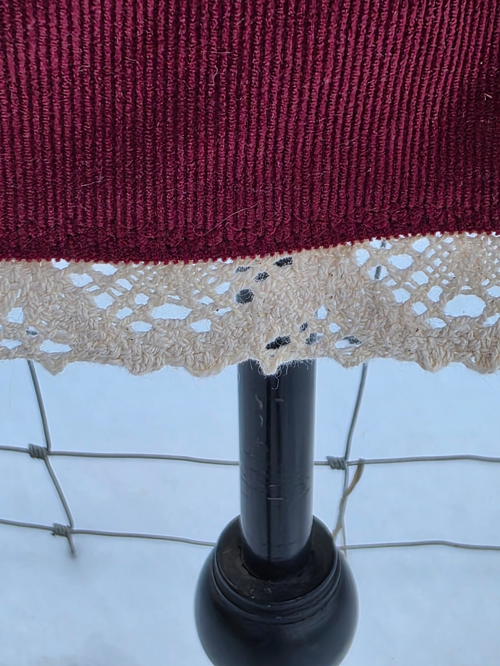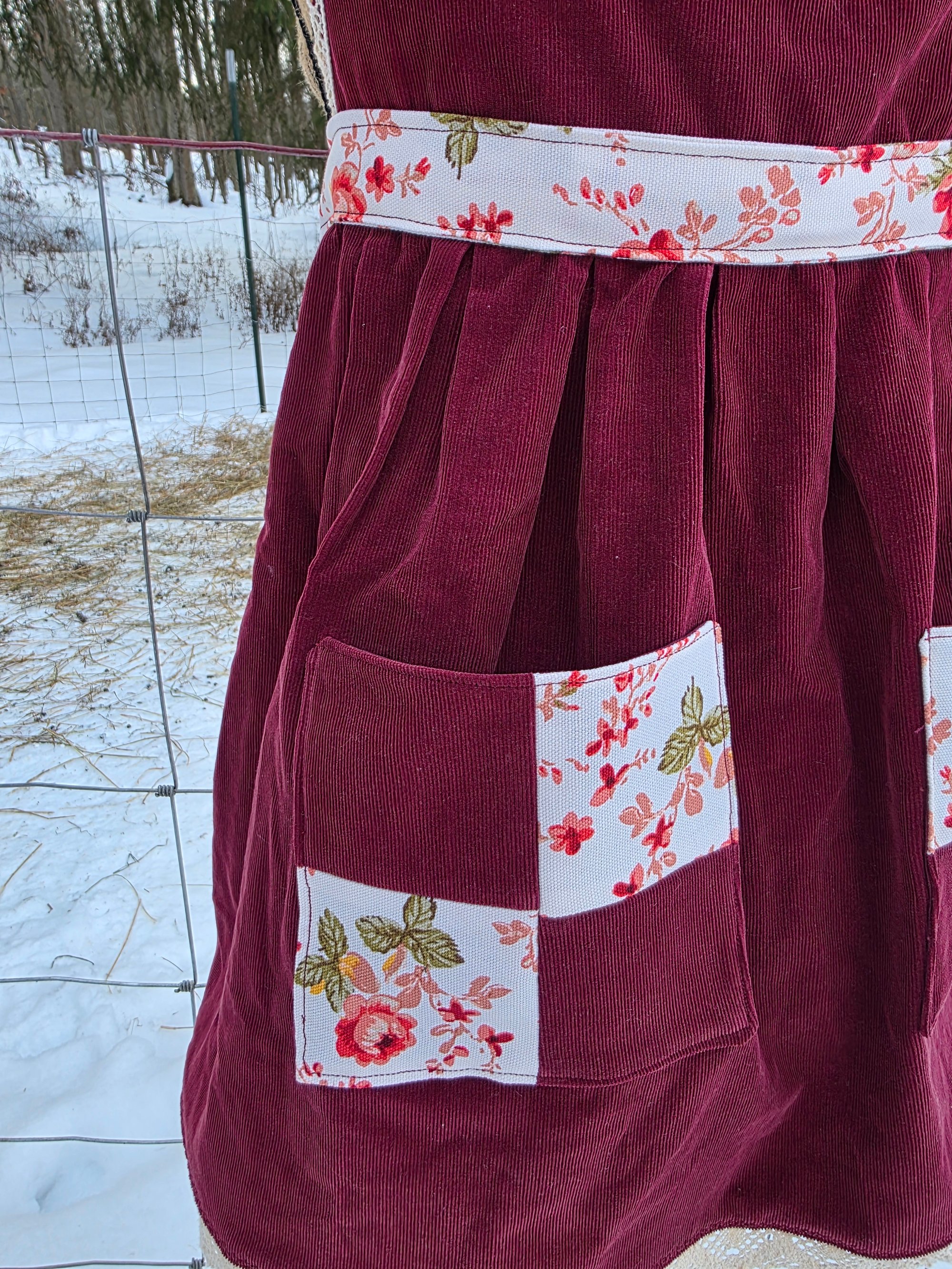 Made from an upcycled 100% cotton cordoroy dress, and 100% cotton canvas, with 100% cotton lace trimming. Adjustable at the neck strap, with waist ties measuring 53" from end to end, length is 23" from top to bottom, and the bodice top is 12" across.