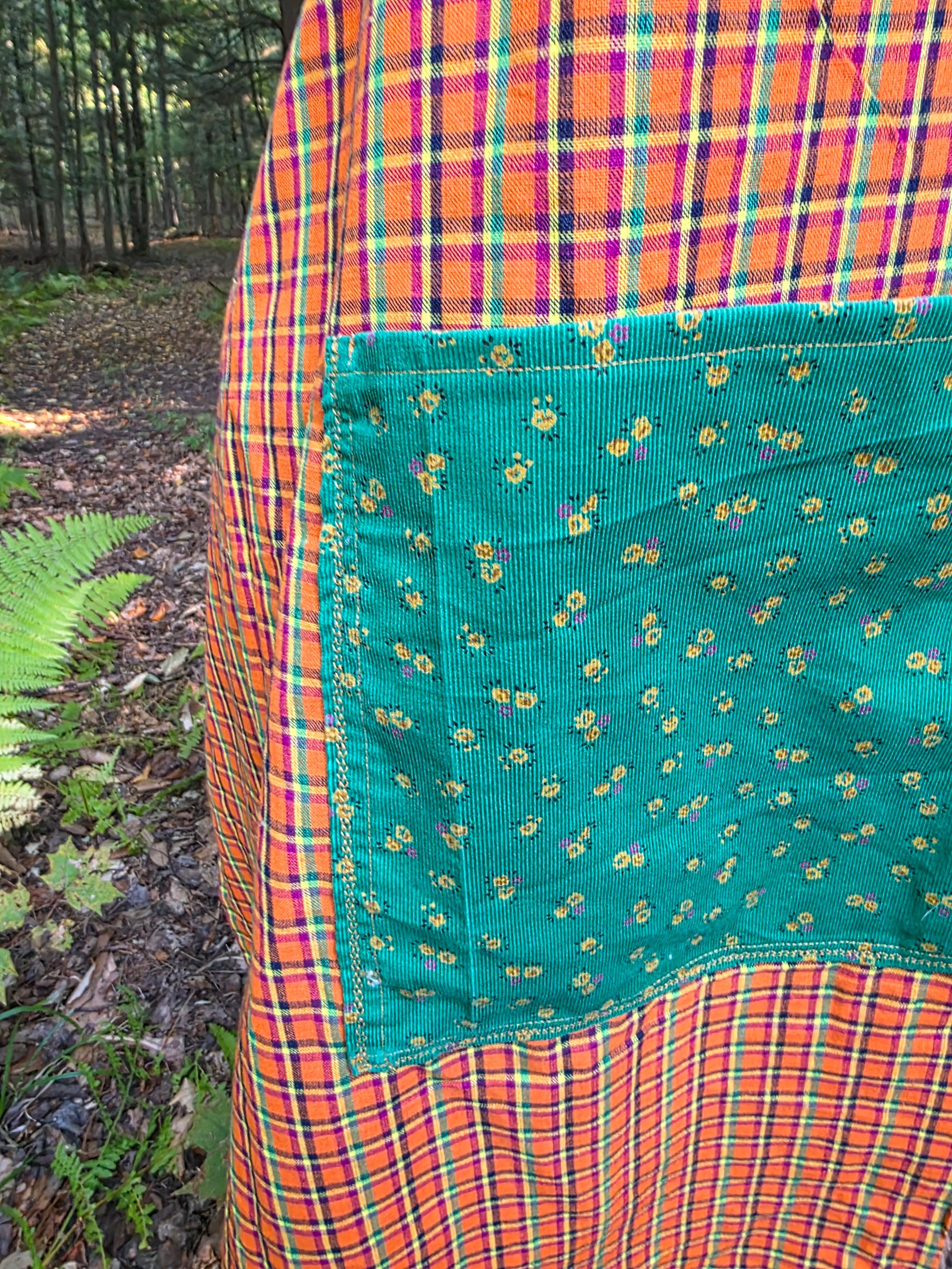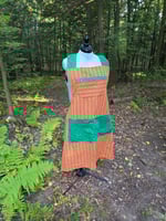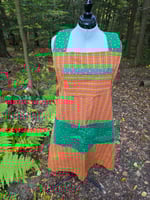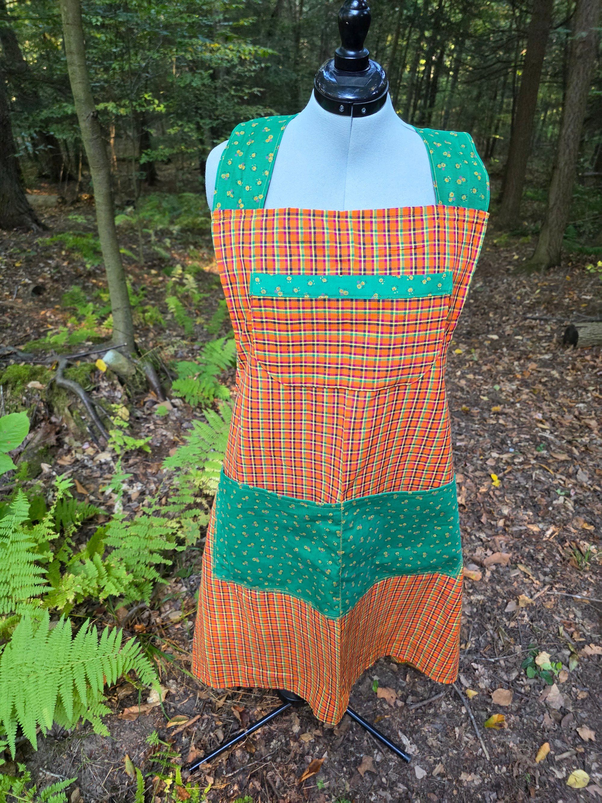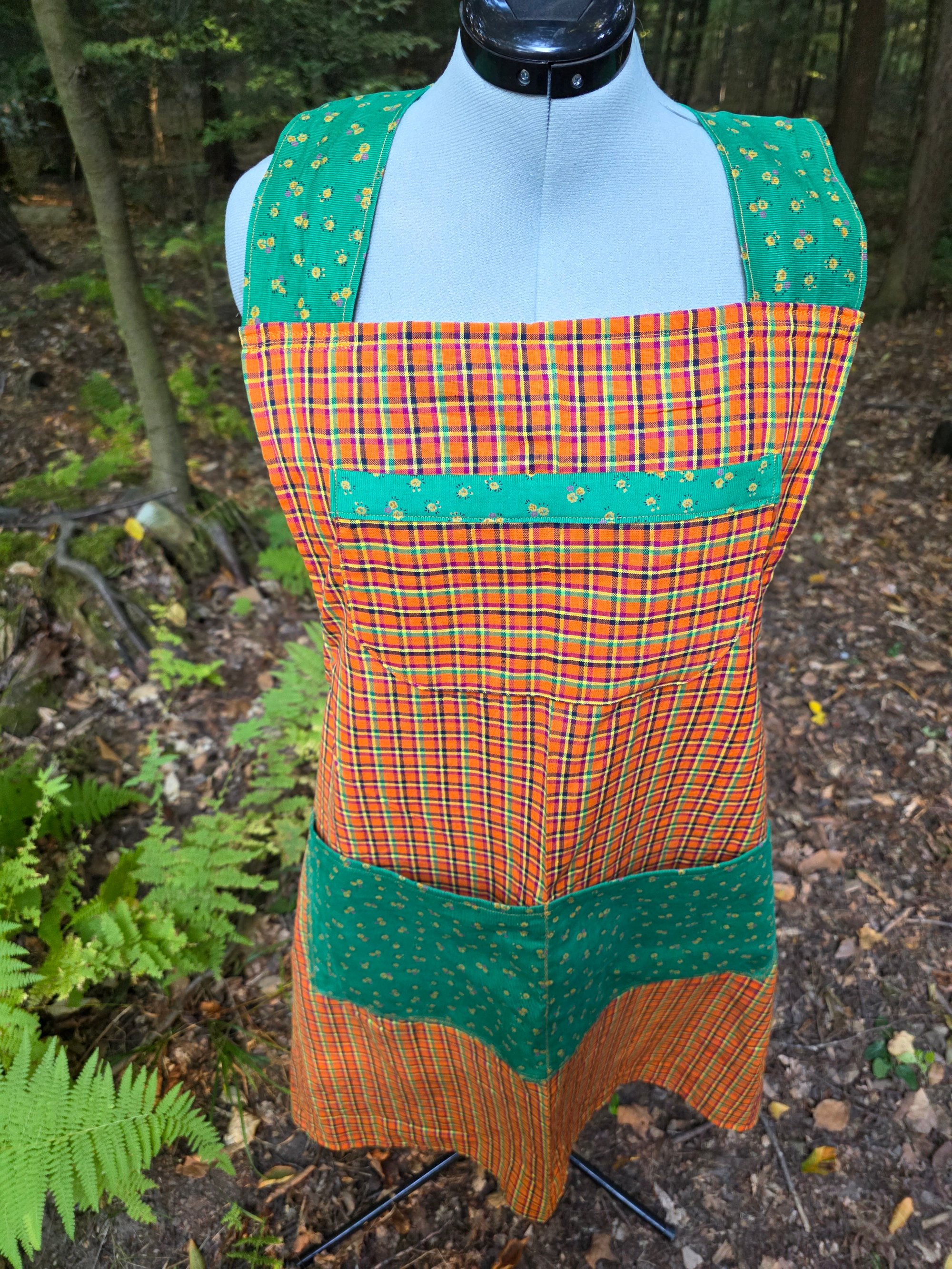 Made from all 100% Cotton, heavier weight fabrics, this apron is designed to fit XL through 3XL ladies. Three roomy pockets in front to help you get your tasks done while looking bright and lovely!