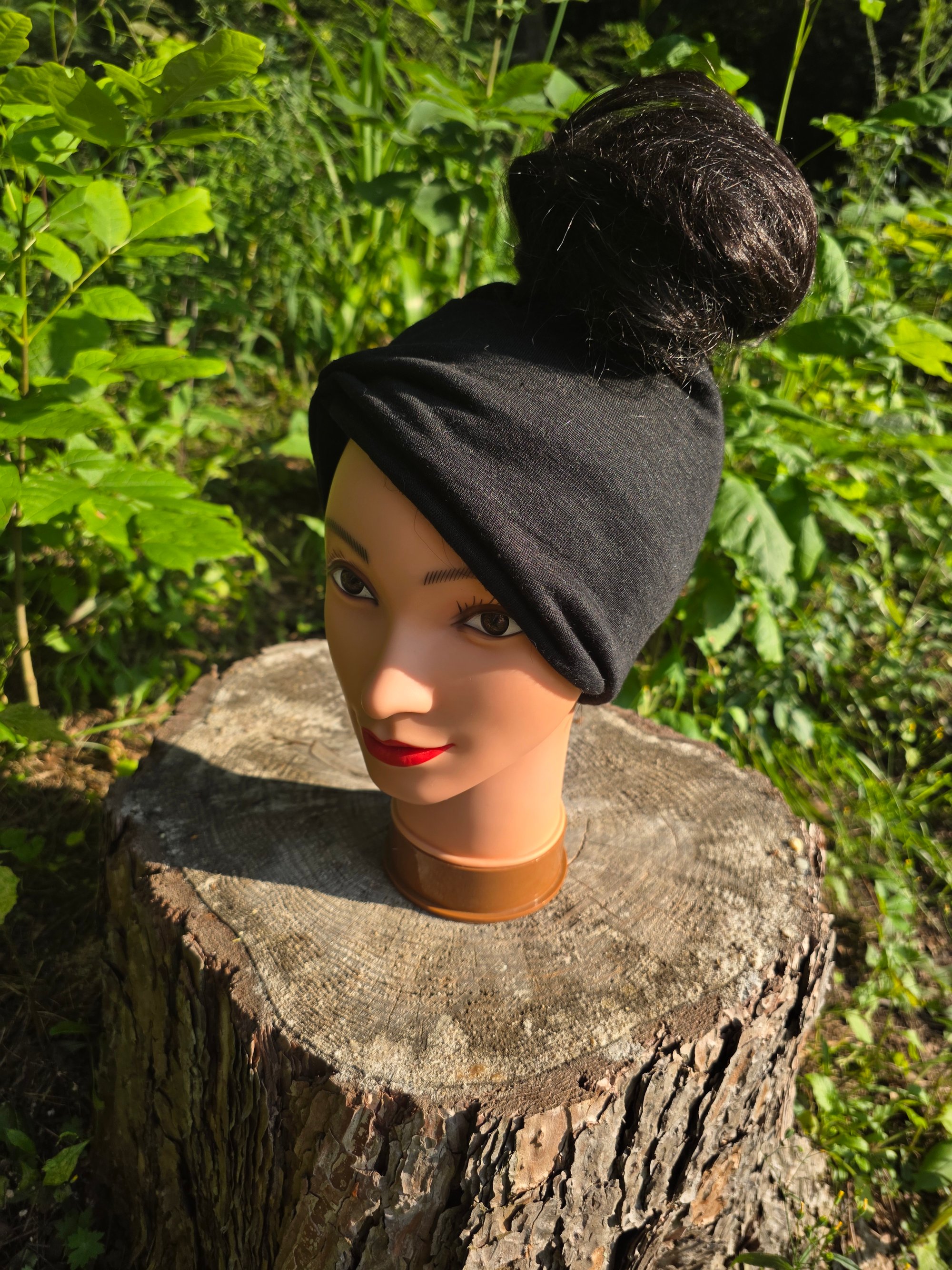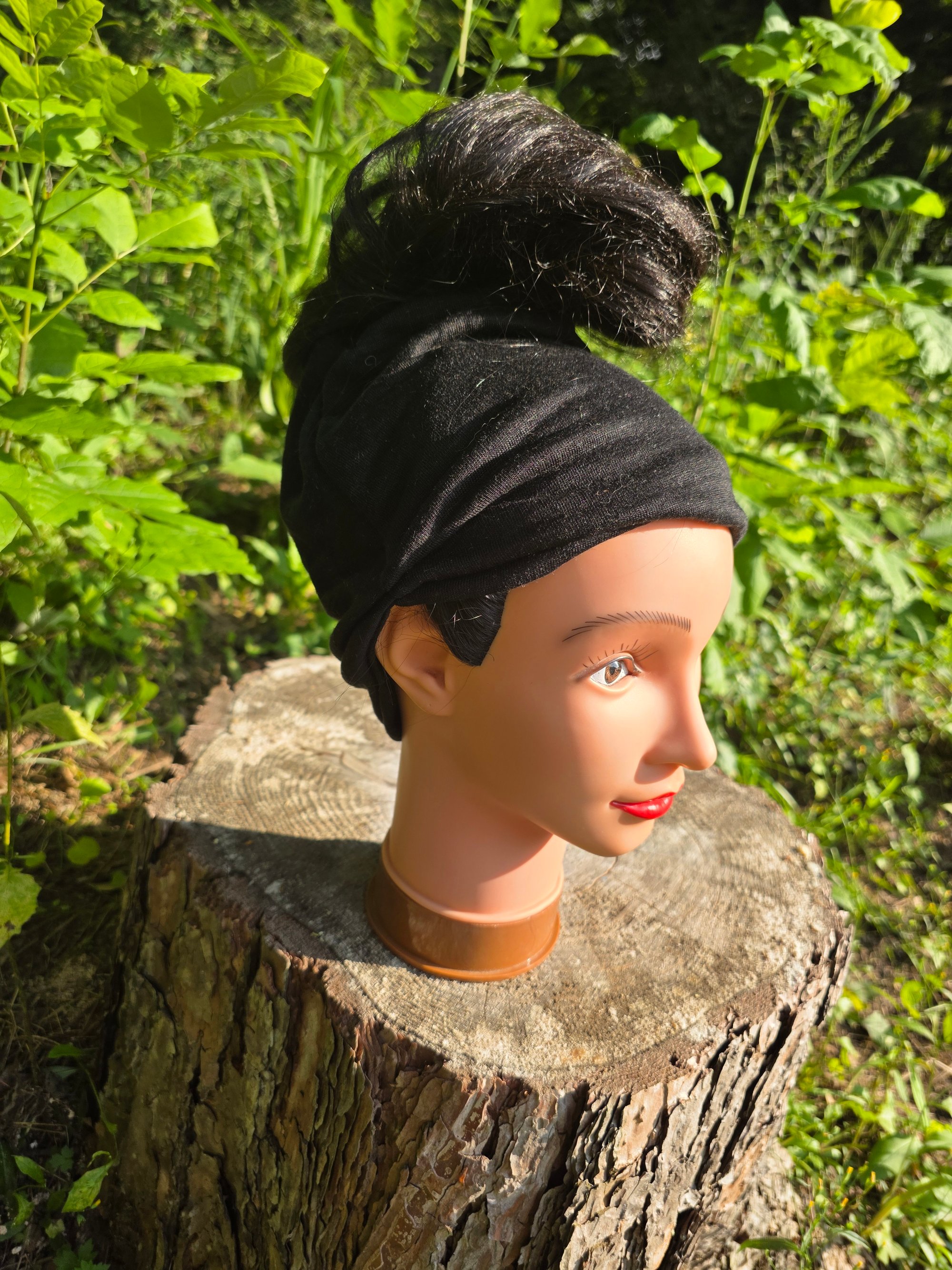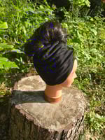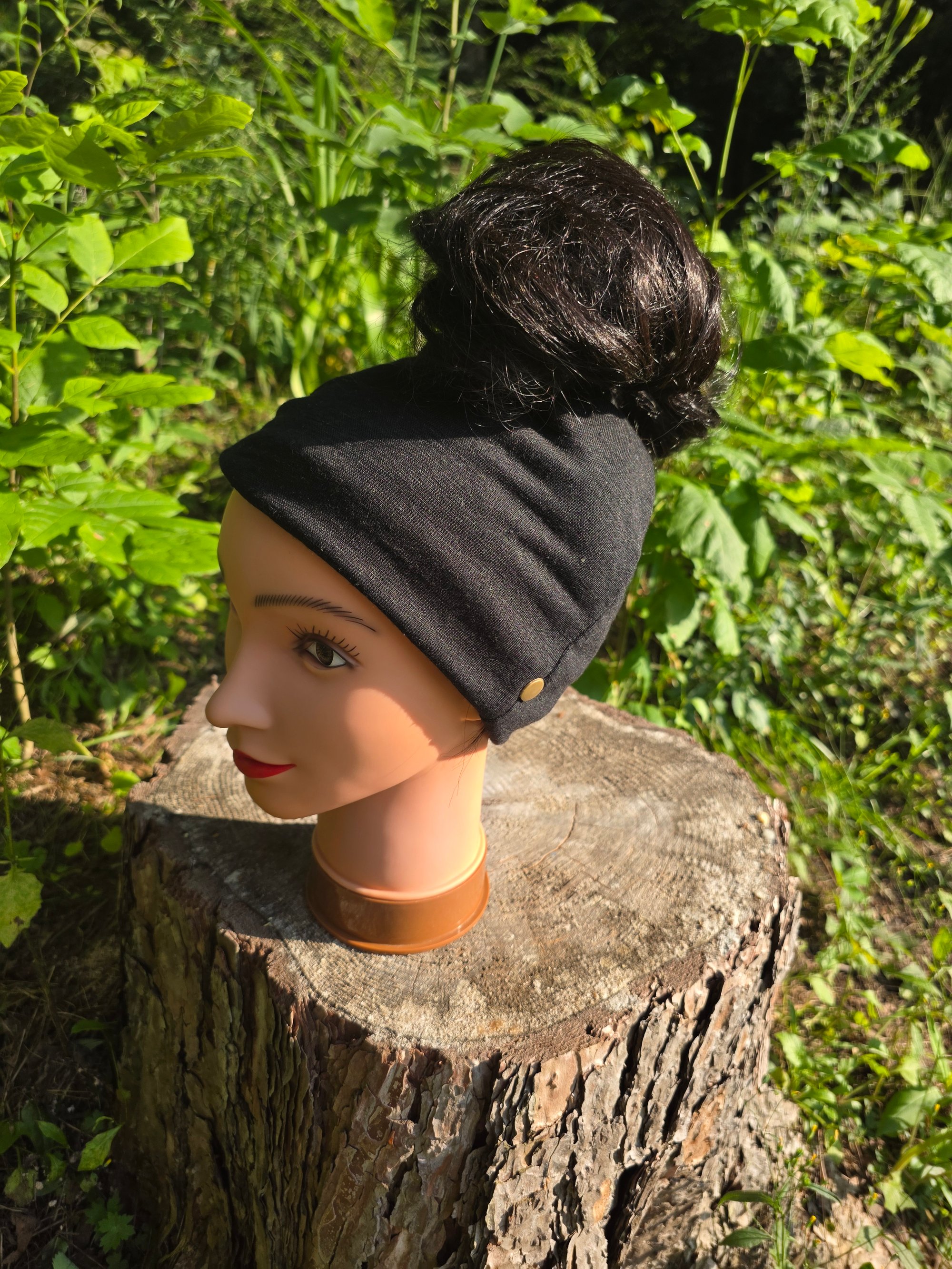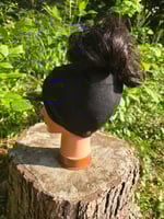 Made from 100% linen knit, doubled- with an elasticized top opening for your pony, braid, bun, etc. One side is cinched and the other has a fold-under with a working plastic, hypoallergenic snap. This hat can be styled in numerous ways to suit your face shape and personal style.