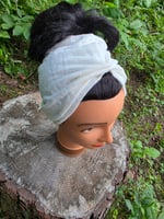 Made from 100% knit linen fabric, these hats have an elasticized hole at the top for your pony, braid, etc. You simply put your hand down through the ponytail opening, pull your hair up through, then arrange the hat in the style that pleases you. The snap can be released for more coverage on that side, and you can be creative- as there really are multiple ways to style this hat.