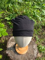 Made from 100% linen knit, doubled. The snaps are hypoallergenic plastic, and they can be undone to let down one or both sides of the brim.