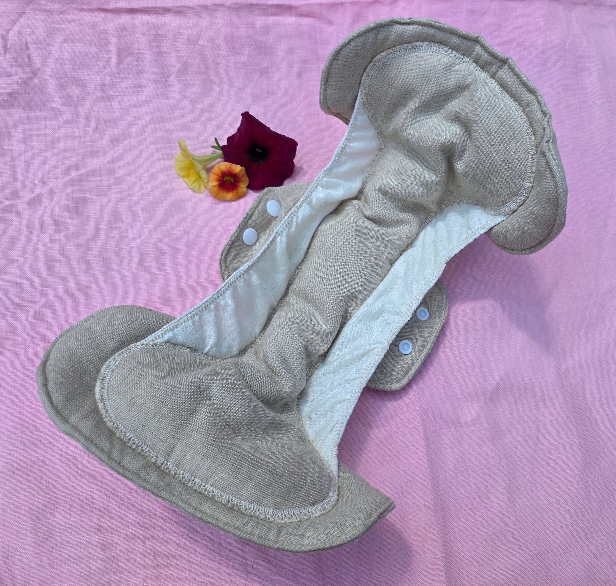 Made from 100% Linen Fabric with 100% Natural Cotton Absorbency Layers, these pads are both comfortable and capable- for post Partum use. Each pad is 16.5" long, and 9" wide at each end. The soft and stretchy side gaurds are 100% knit linen, and the snaps are heavy duty plastic. This set includes 2 pads.