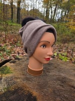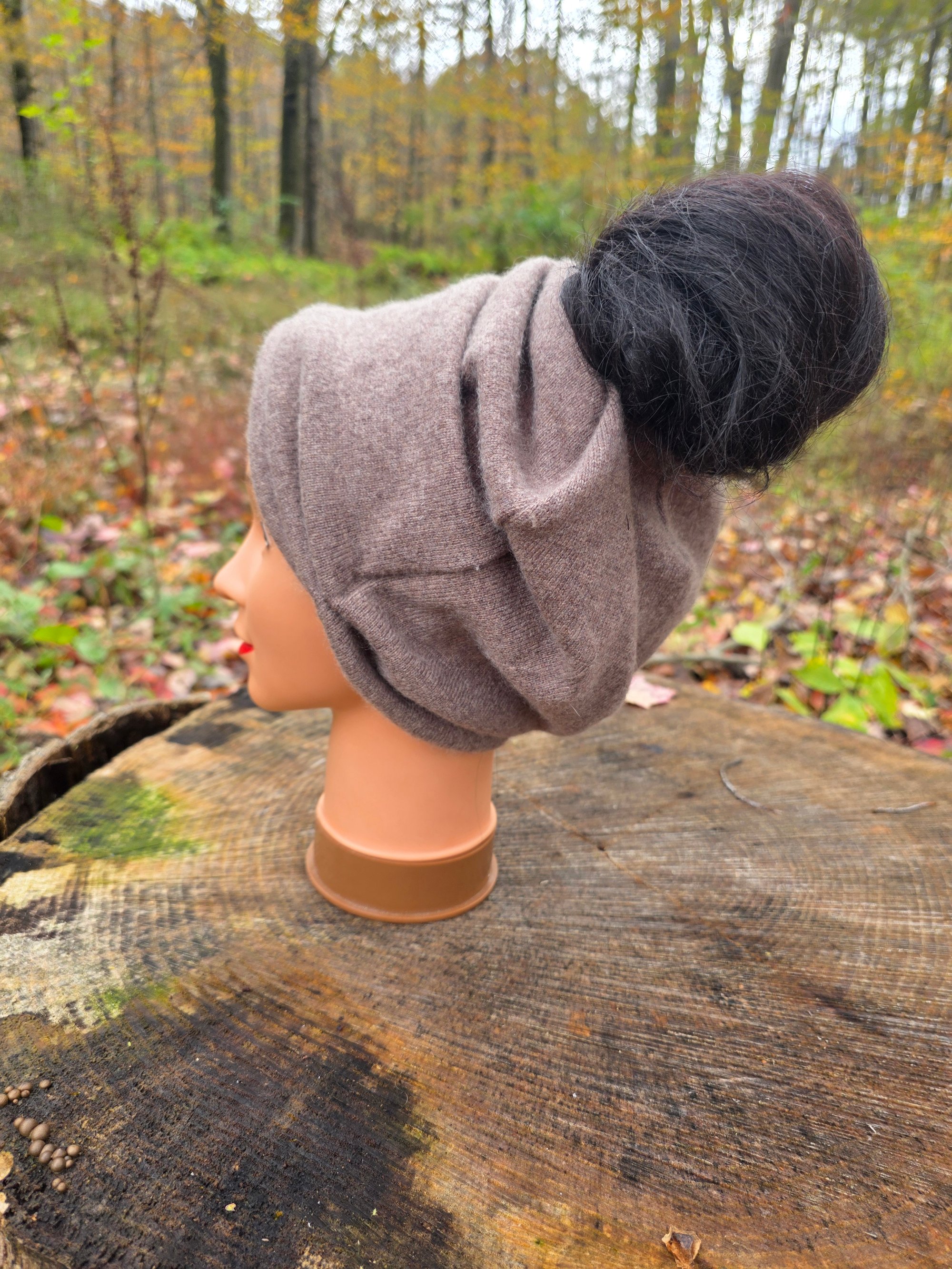 Made from an upcycled 100% Cashmere sweater, this hat features an elasticized top opening to pull your hair up through, and side snaps to help adjust the brim and style. This hat best fits Medium through XXL head sizes.