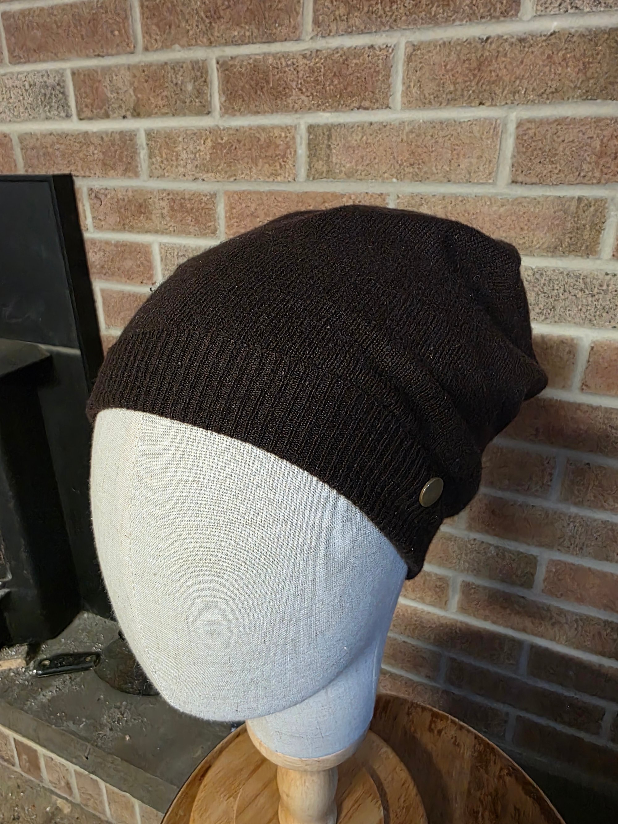 Made from an upcycled 100% Cashmere sweater, this beanie features one snap and is made to best fit head sizes Small through Medium
