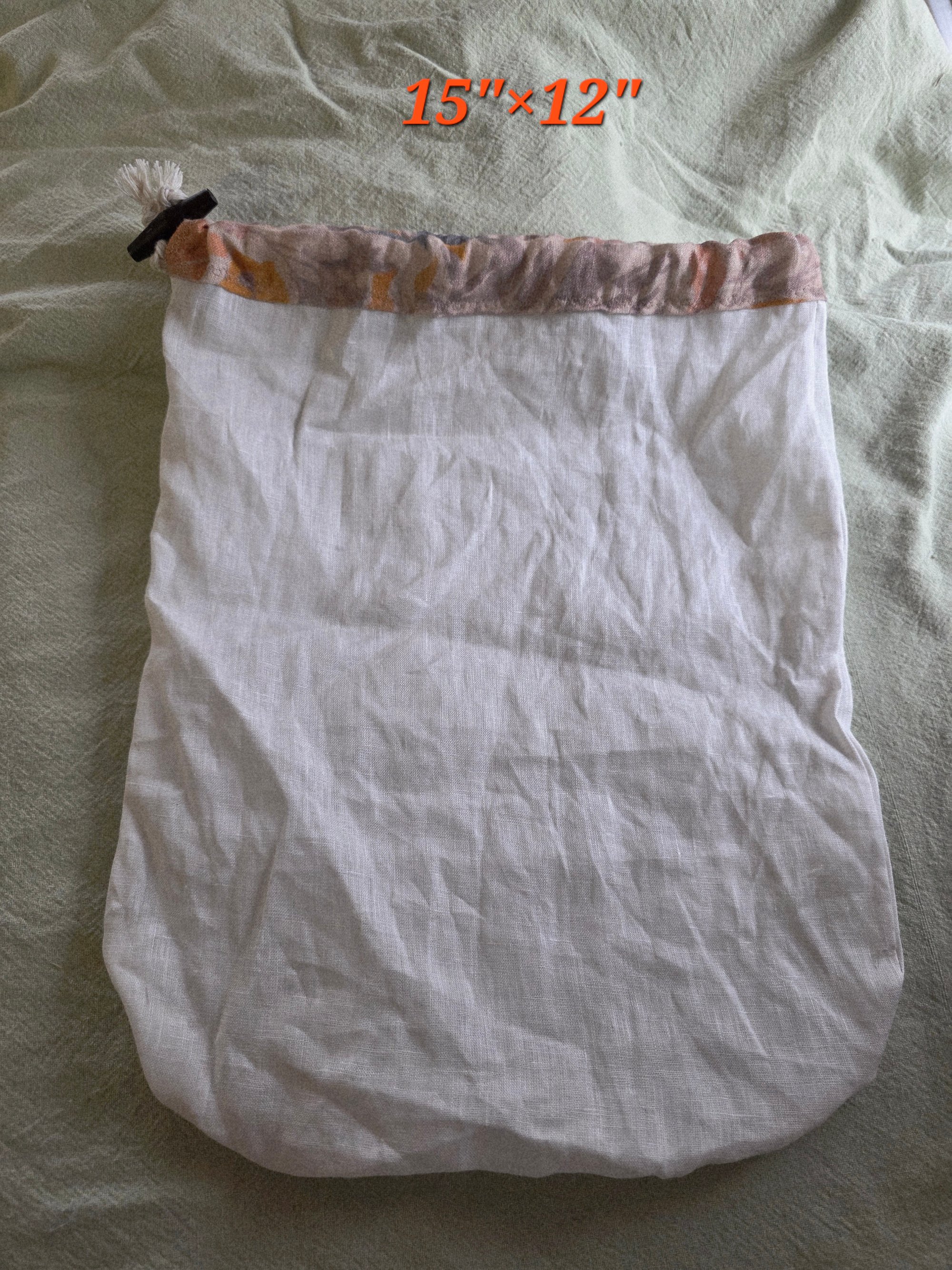 Made with 100% linen fabrics, 100% natural cotton, hand braided drawstring cord, and wood toggle.