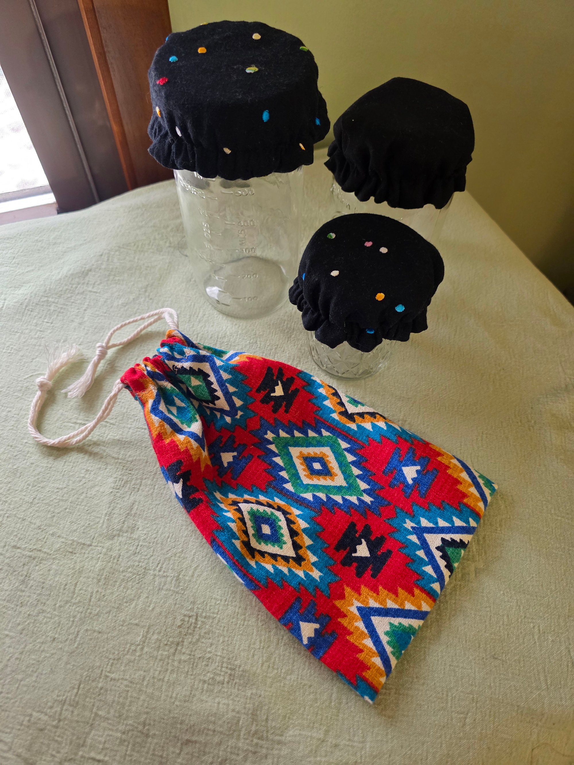 Made from 100% linen fabrics, these jar covers are reversible and fit both regular and wide mouth canning jars. The garlic keeper bag has a natural cotton 2-way drawstring closure.