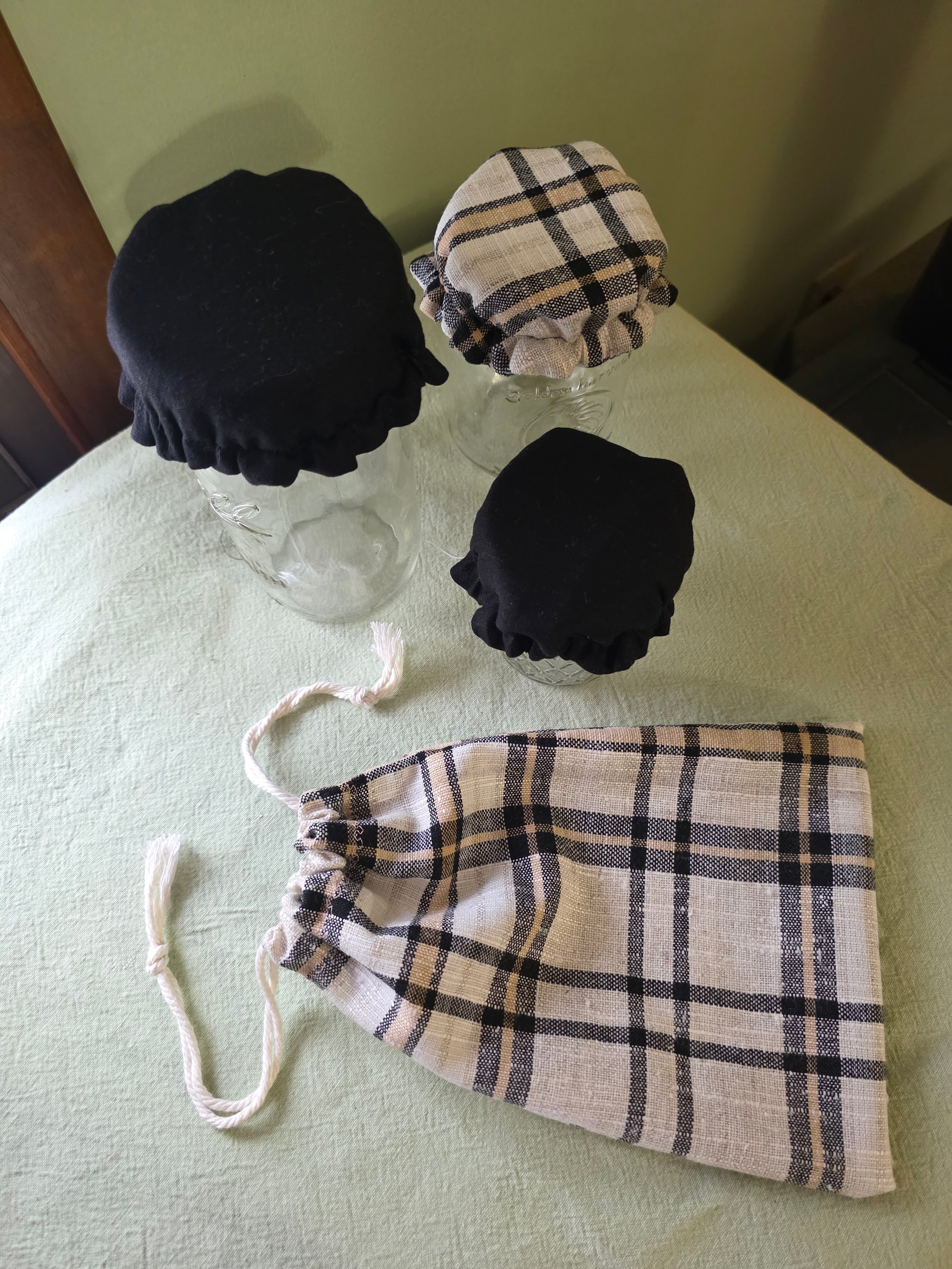 Made from 100% linen fabrics, these jar covers are reversible and fit both regular and wide mouth canning jars. The garlic keeper bag has a natural cotton 2-way drawstring closure.