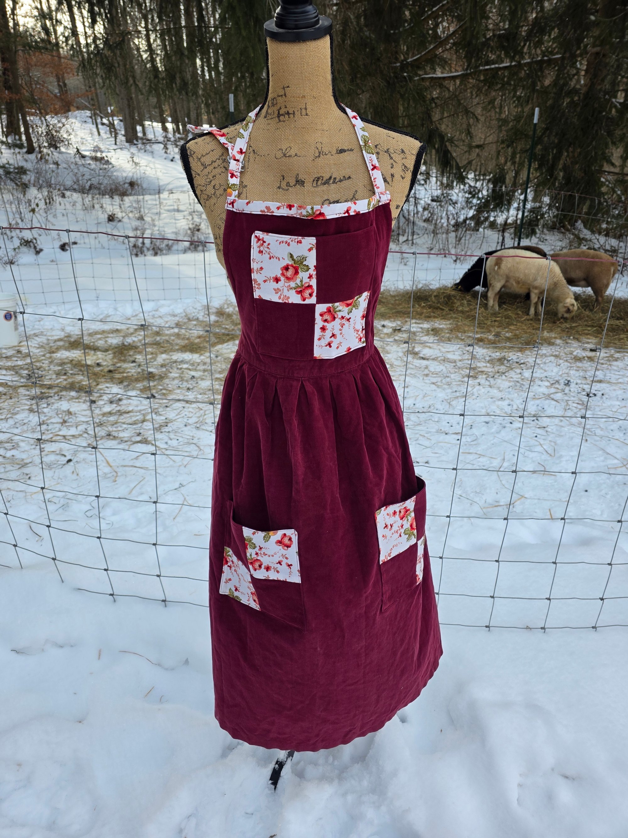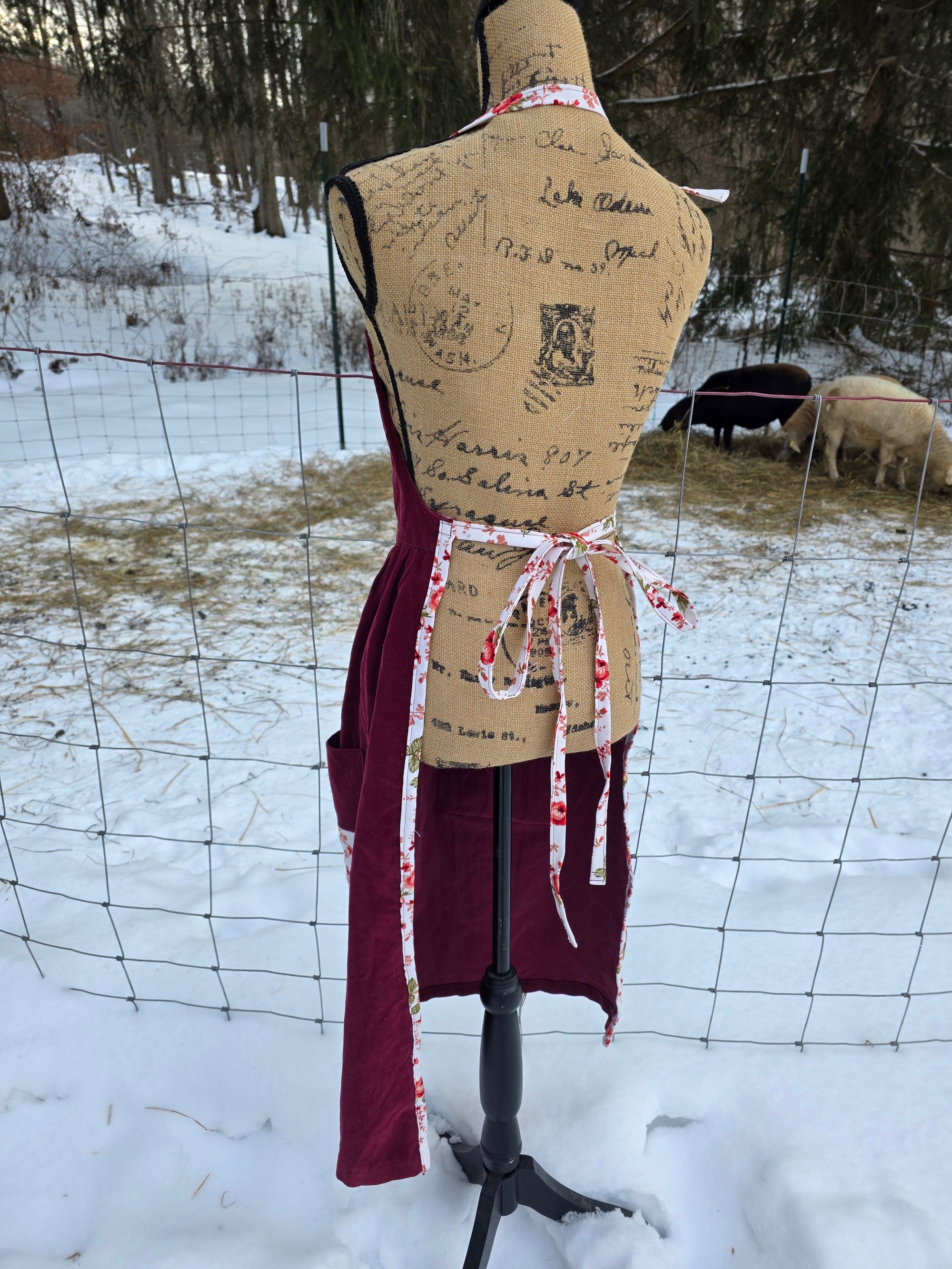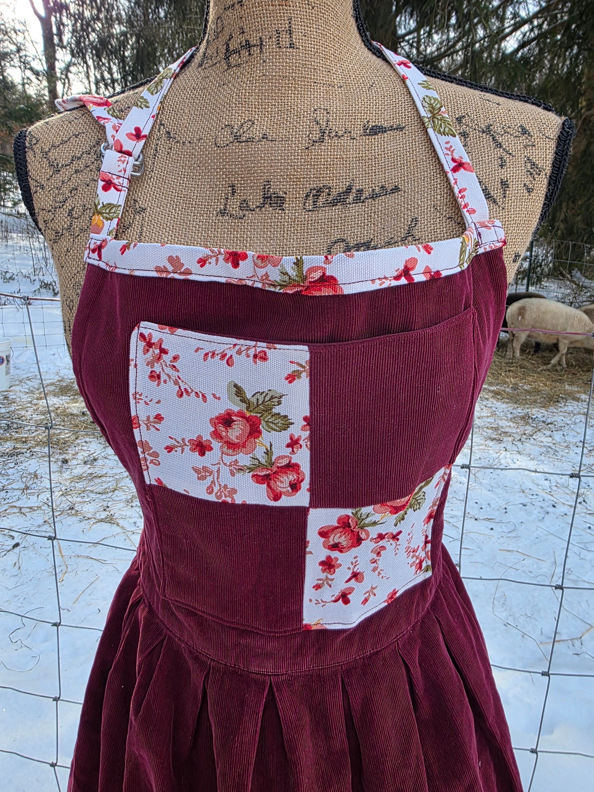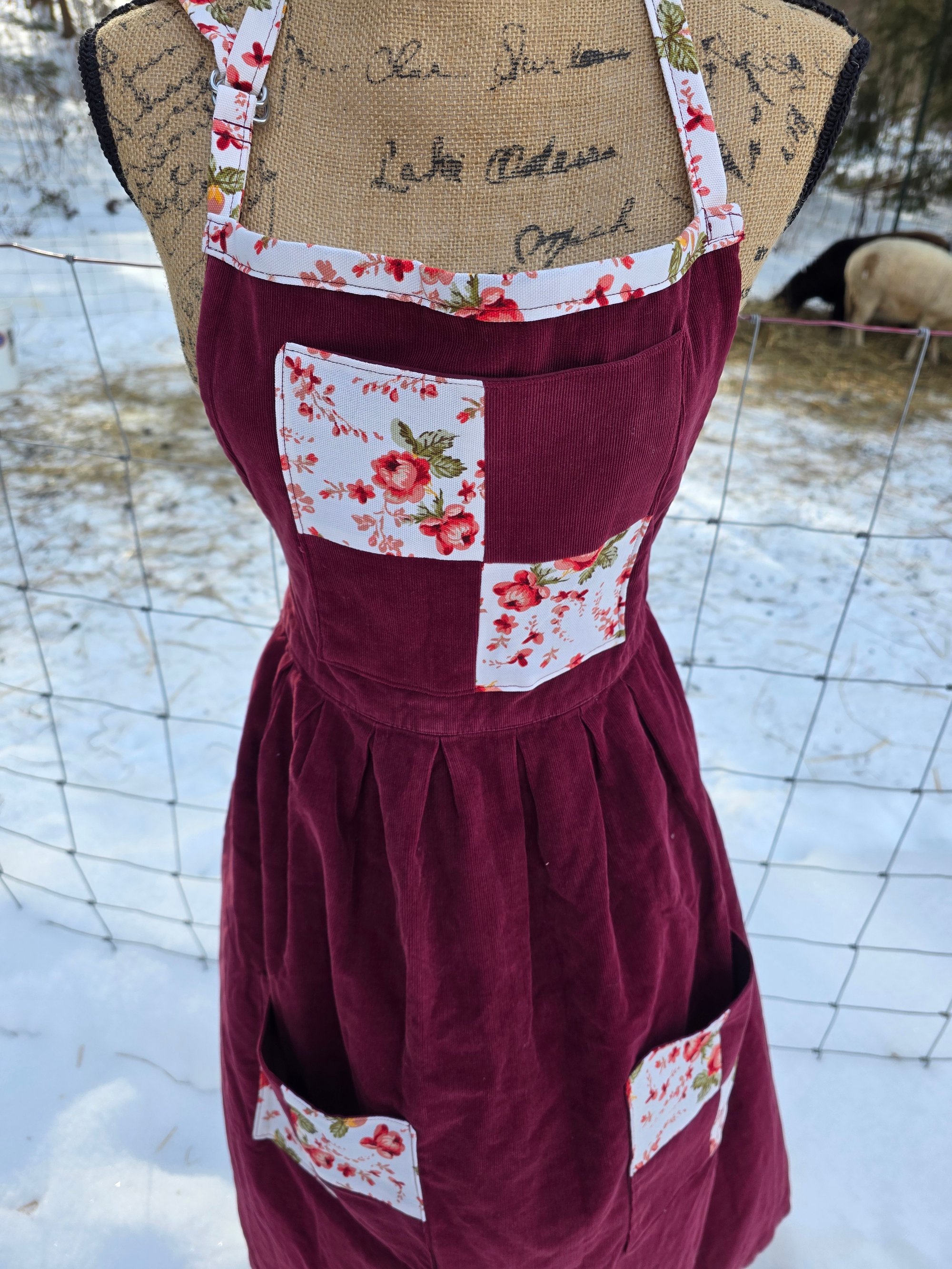 Made from an upcycled 100% cotton Cordoroy dress, and 100% cotton canvas. Features 3 functional pockets , an adjustable neck strap, and generously long waist ties. Fits Small through Plus Size.