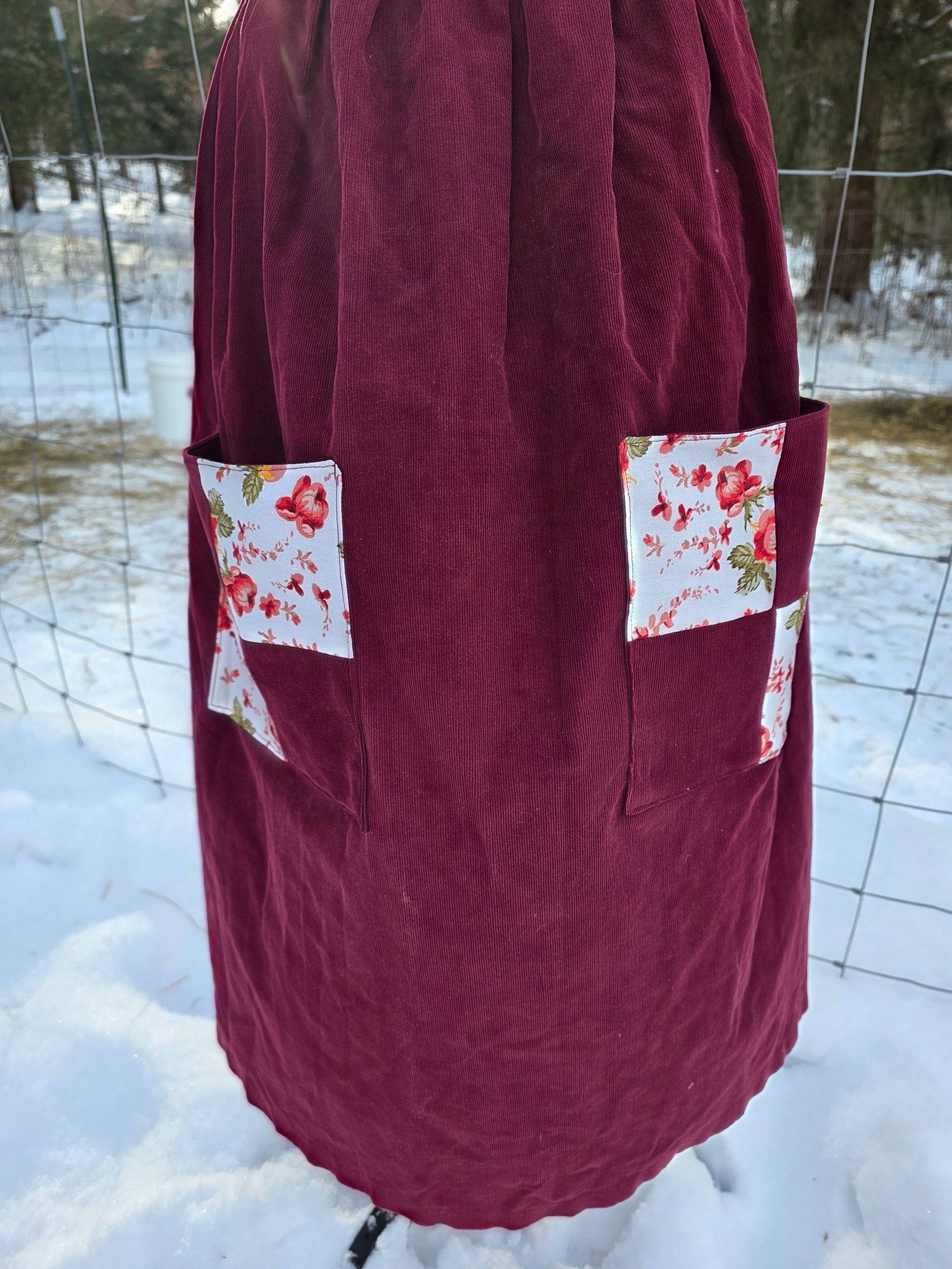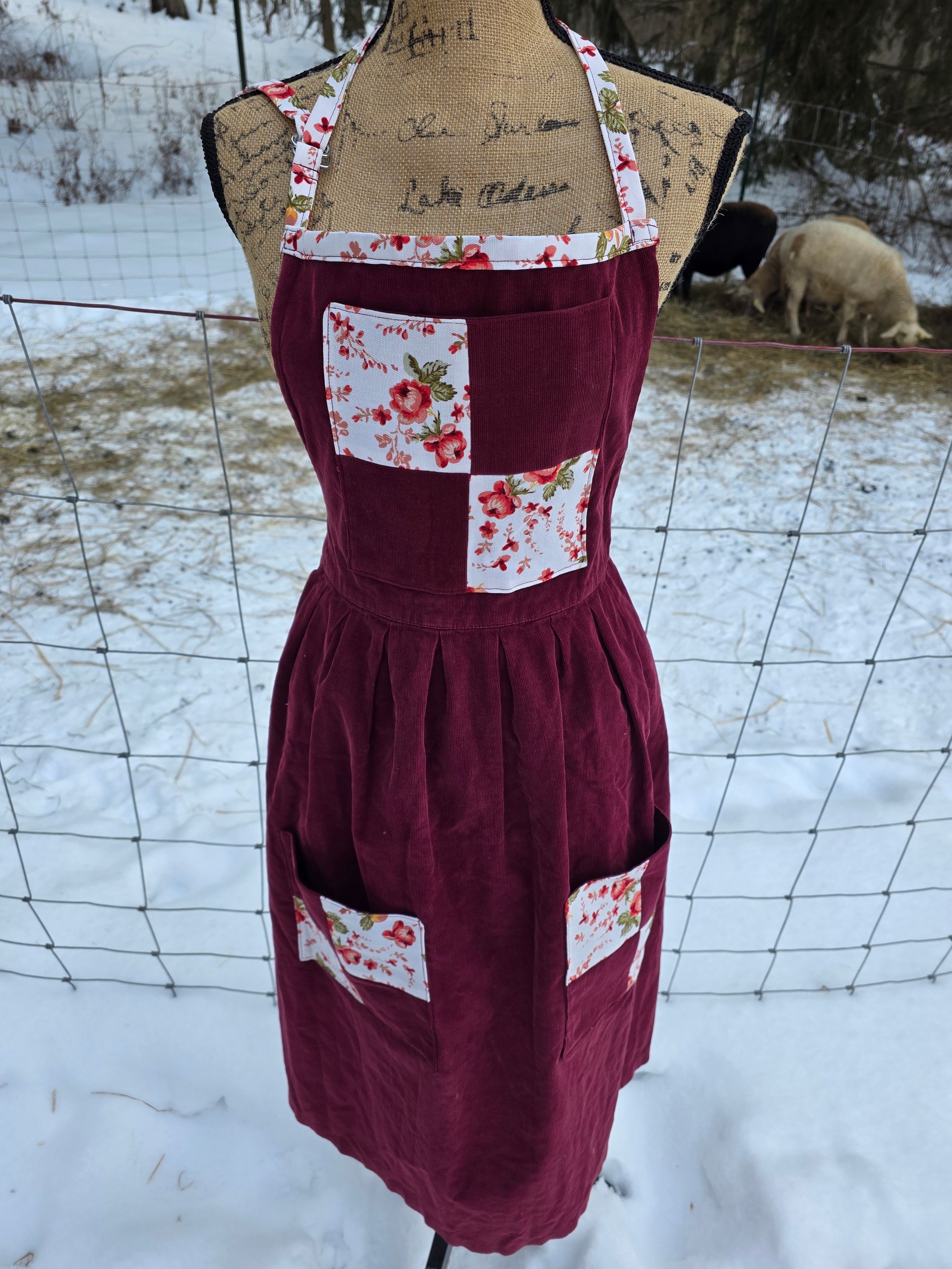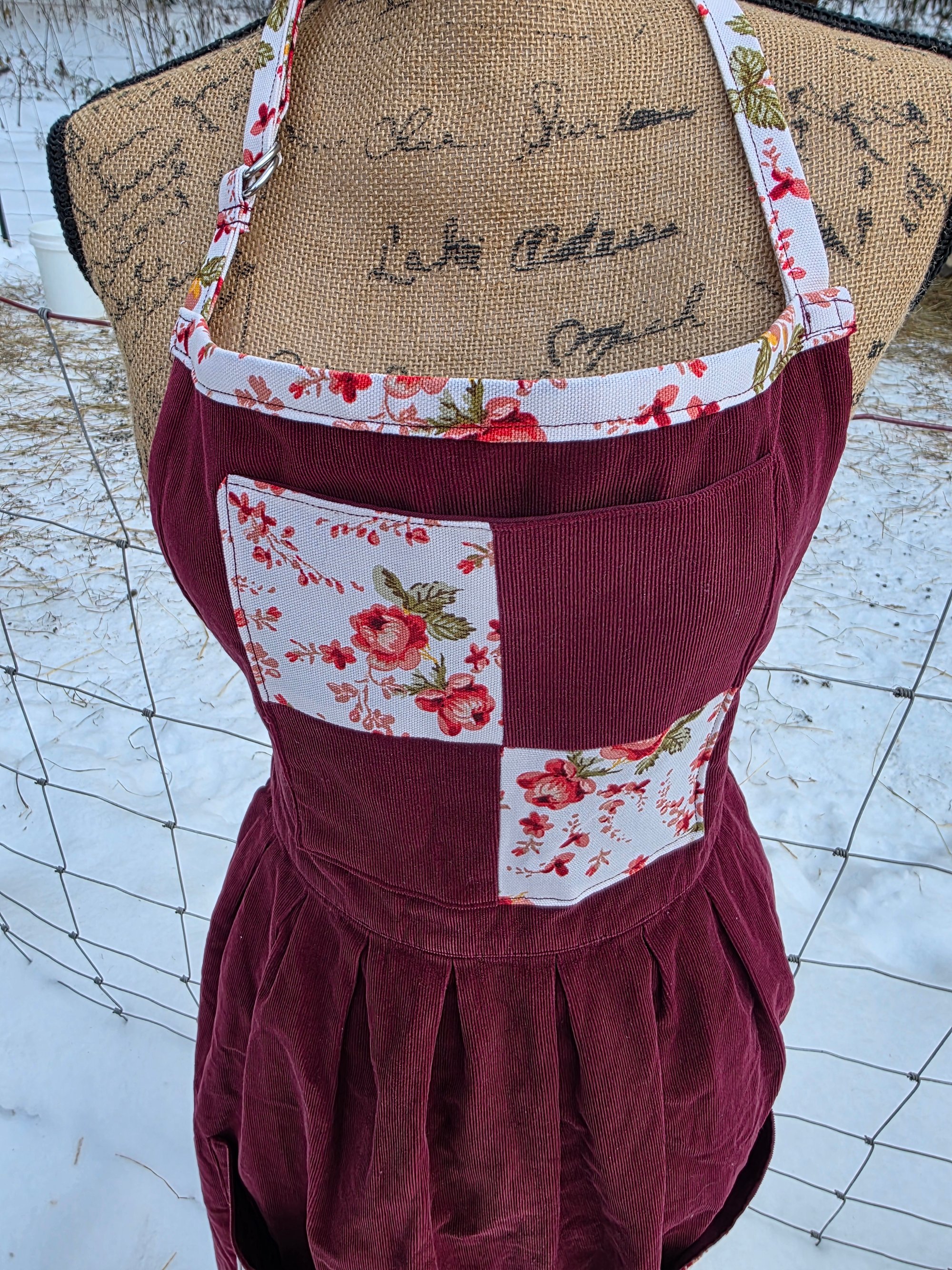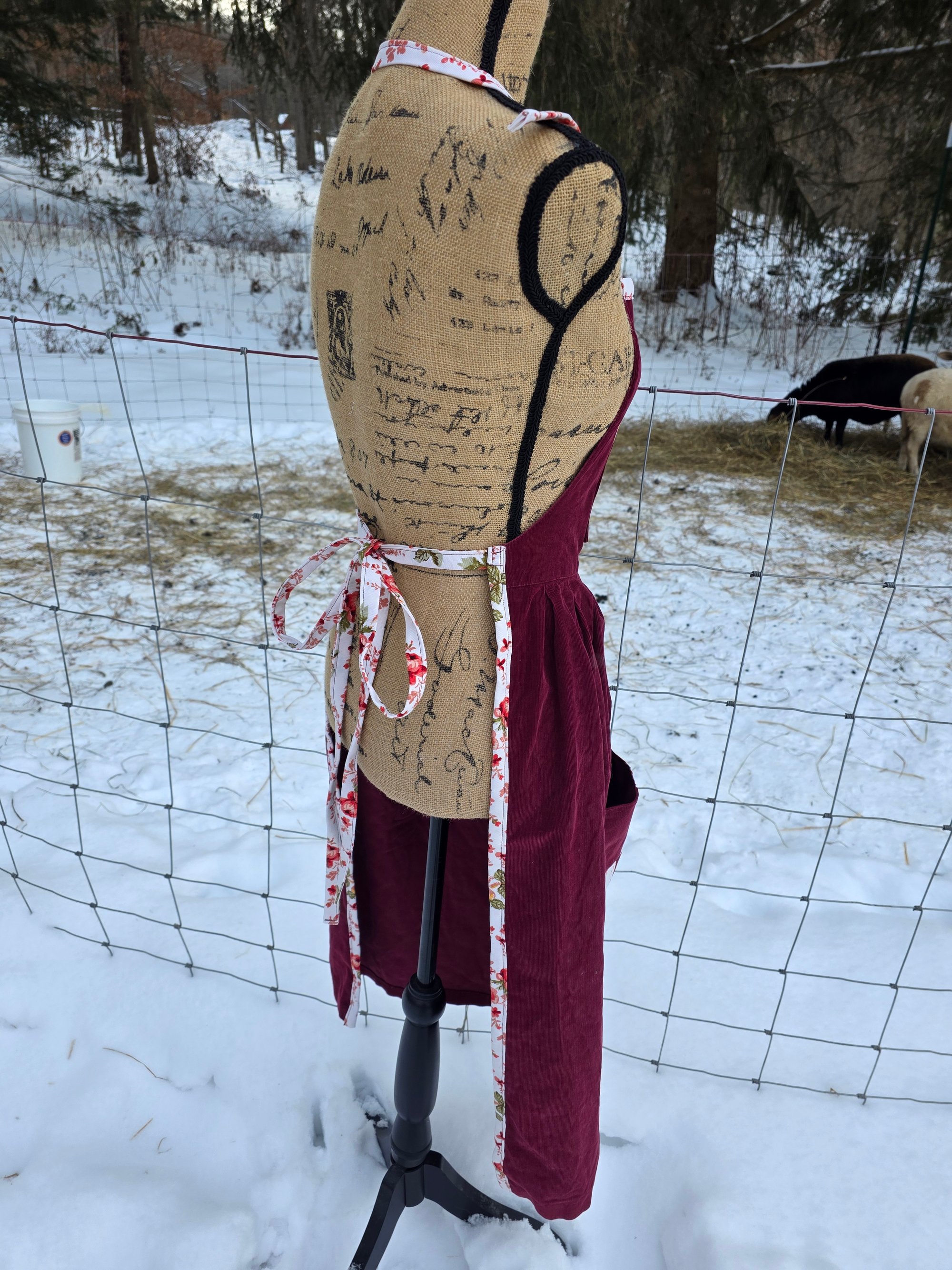 Made from an upcycled 100% cotton Cordoroy dress, and 100% cotton canvas. Features 3 functional pockets , an adjustable neck strap, and generously long waist ties. Fits Small through Plus Size.