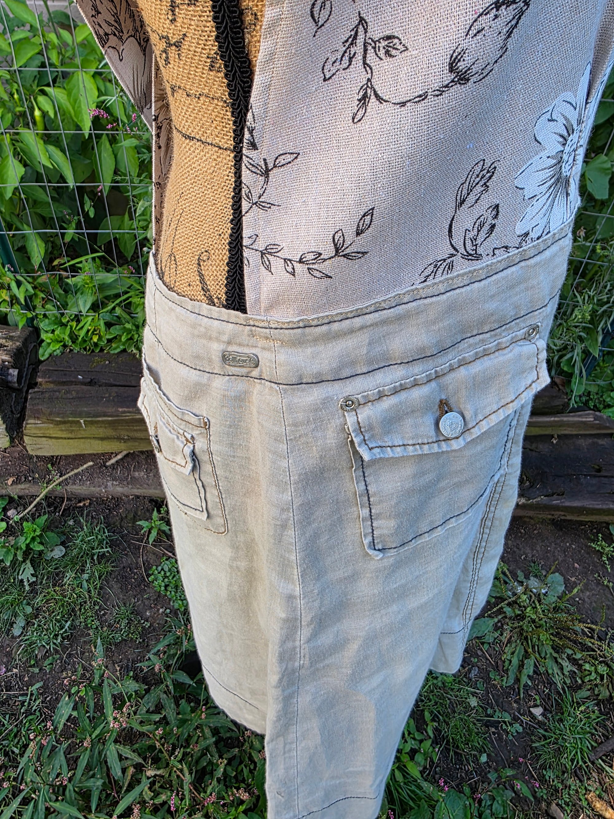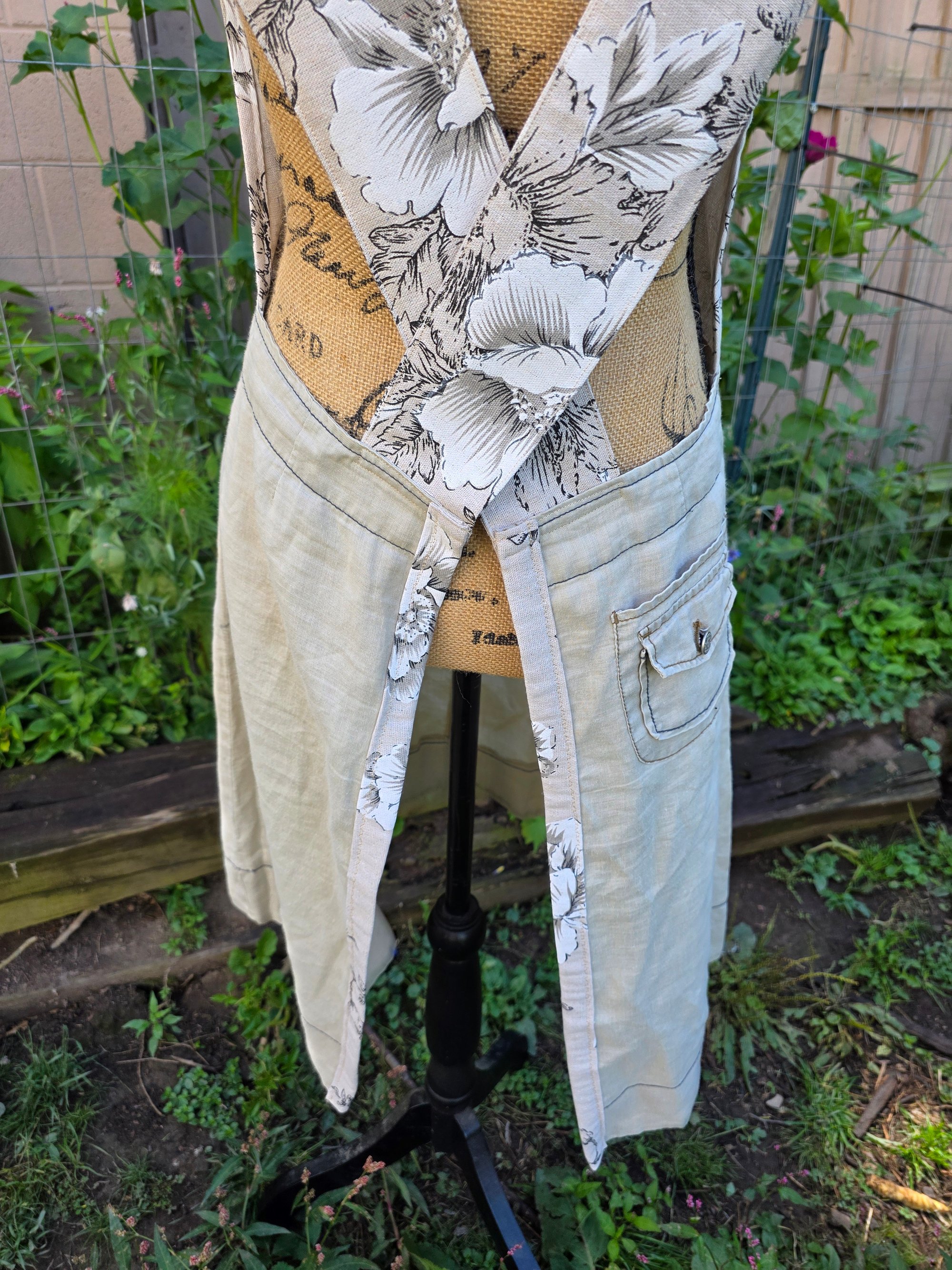 This 100% Linen Apron best fits a size Small through Large, and features 3 small functional pockets, and a more wide bodice to protect your clothing.