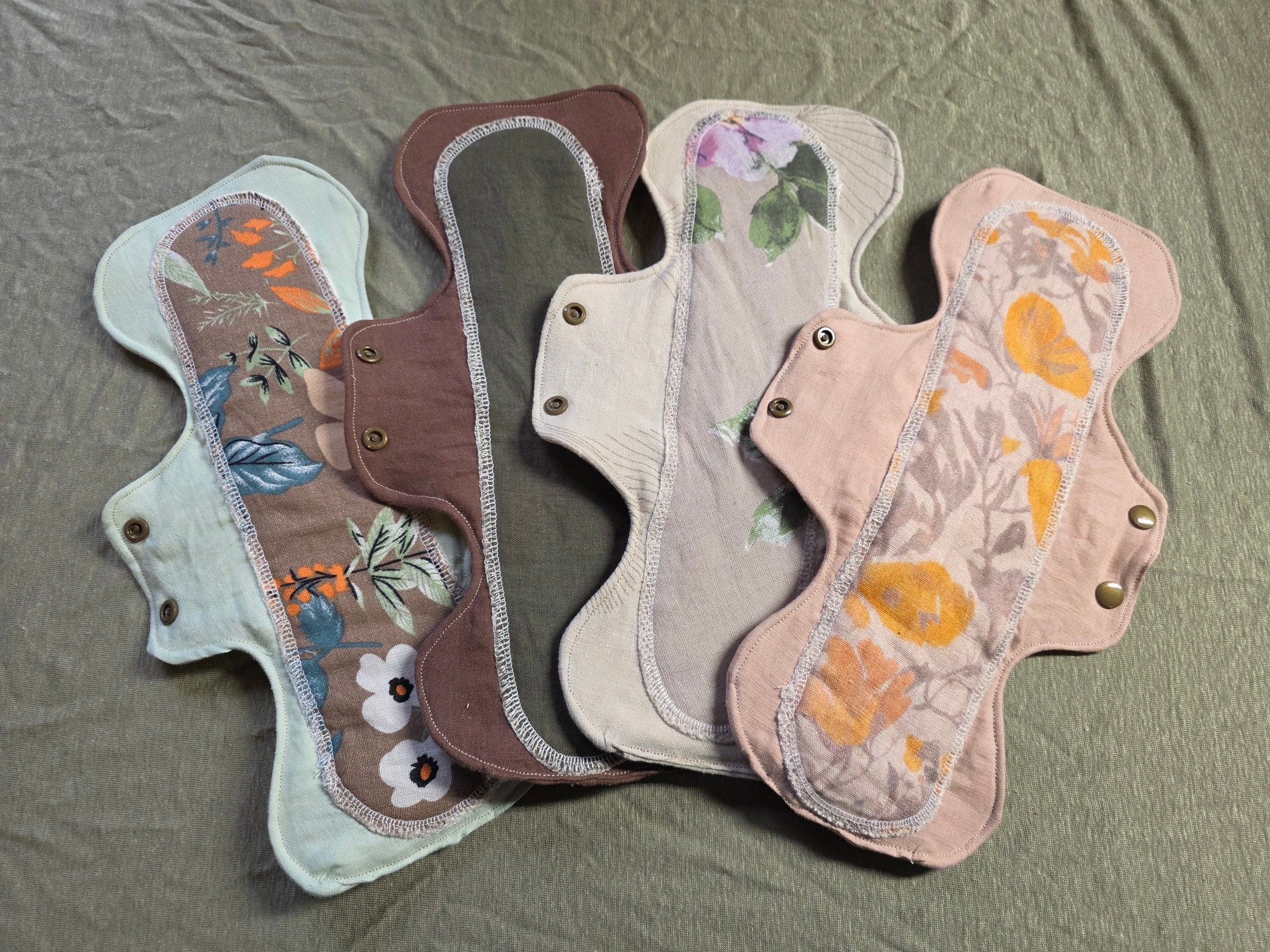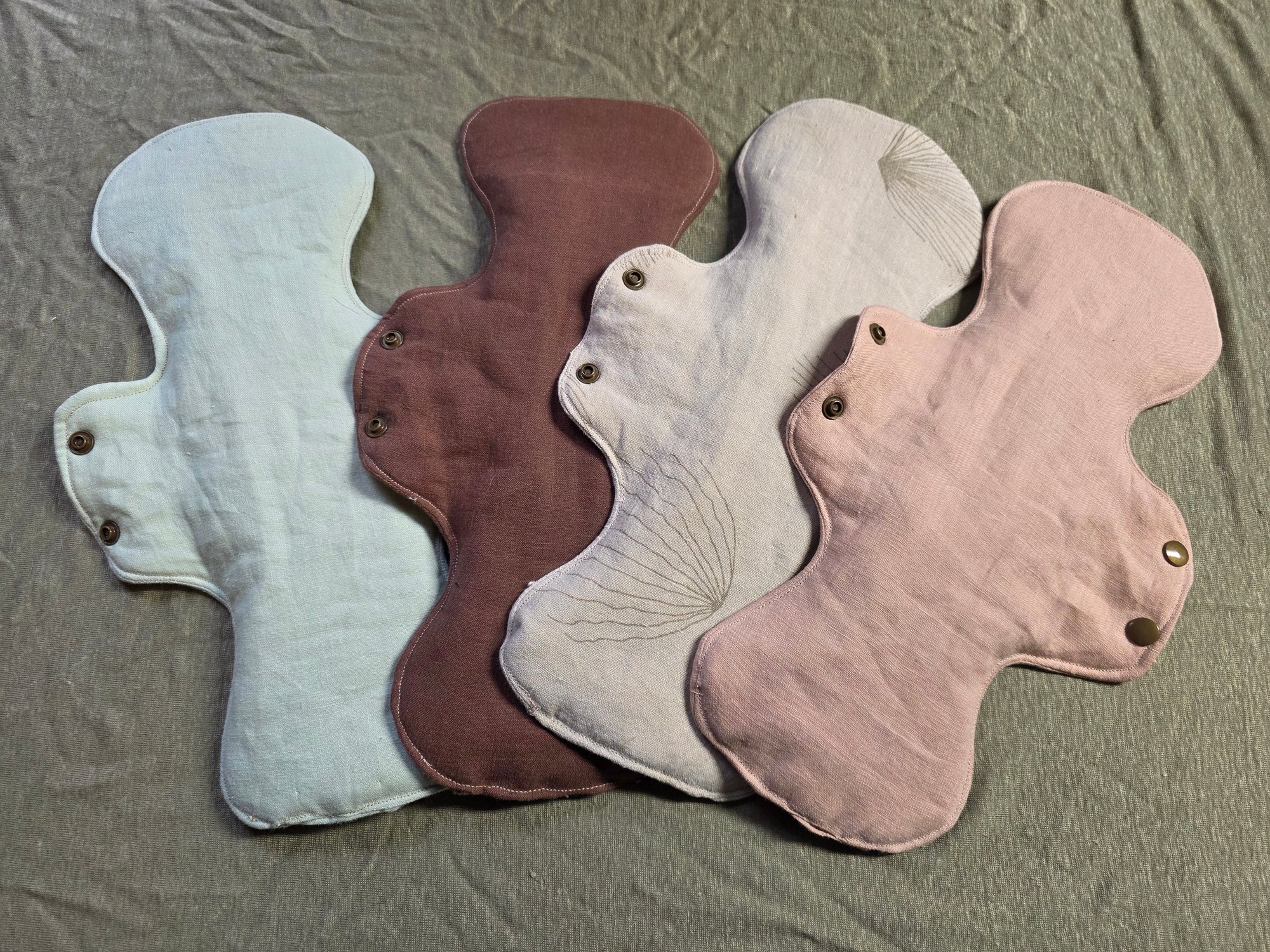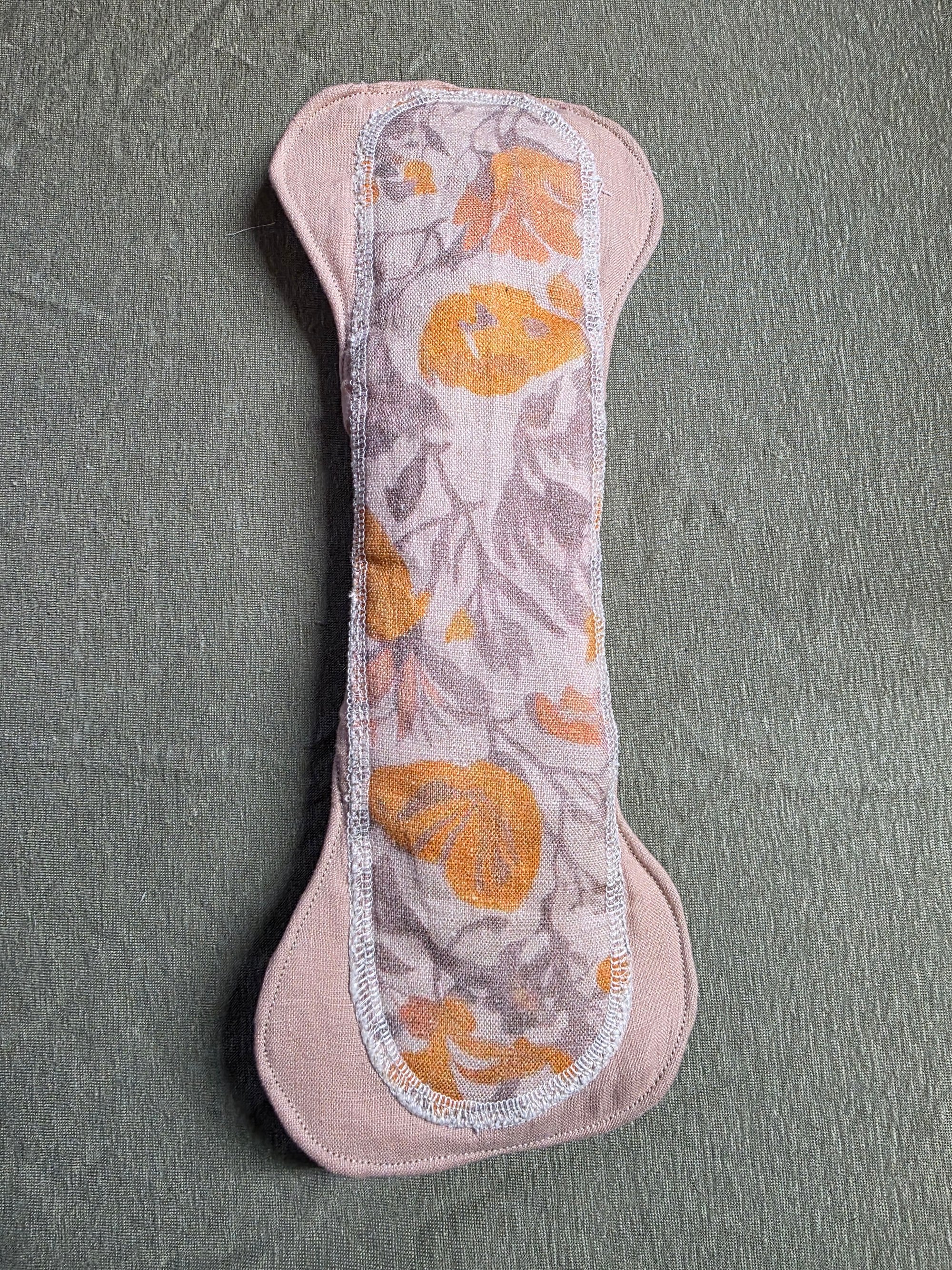 These pads have a "top face" of 100% Linen - some upcycled from clothing and some new, 100% Natural Cotton Absorbency Layers in the middle, and hidden leak protection layer of 100% linen fabric that has been coated on one side with polyurethane, making it a moisture resistant barrier.