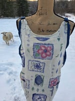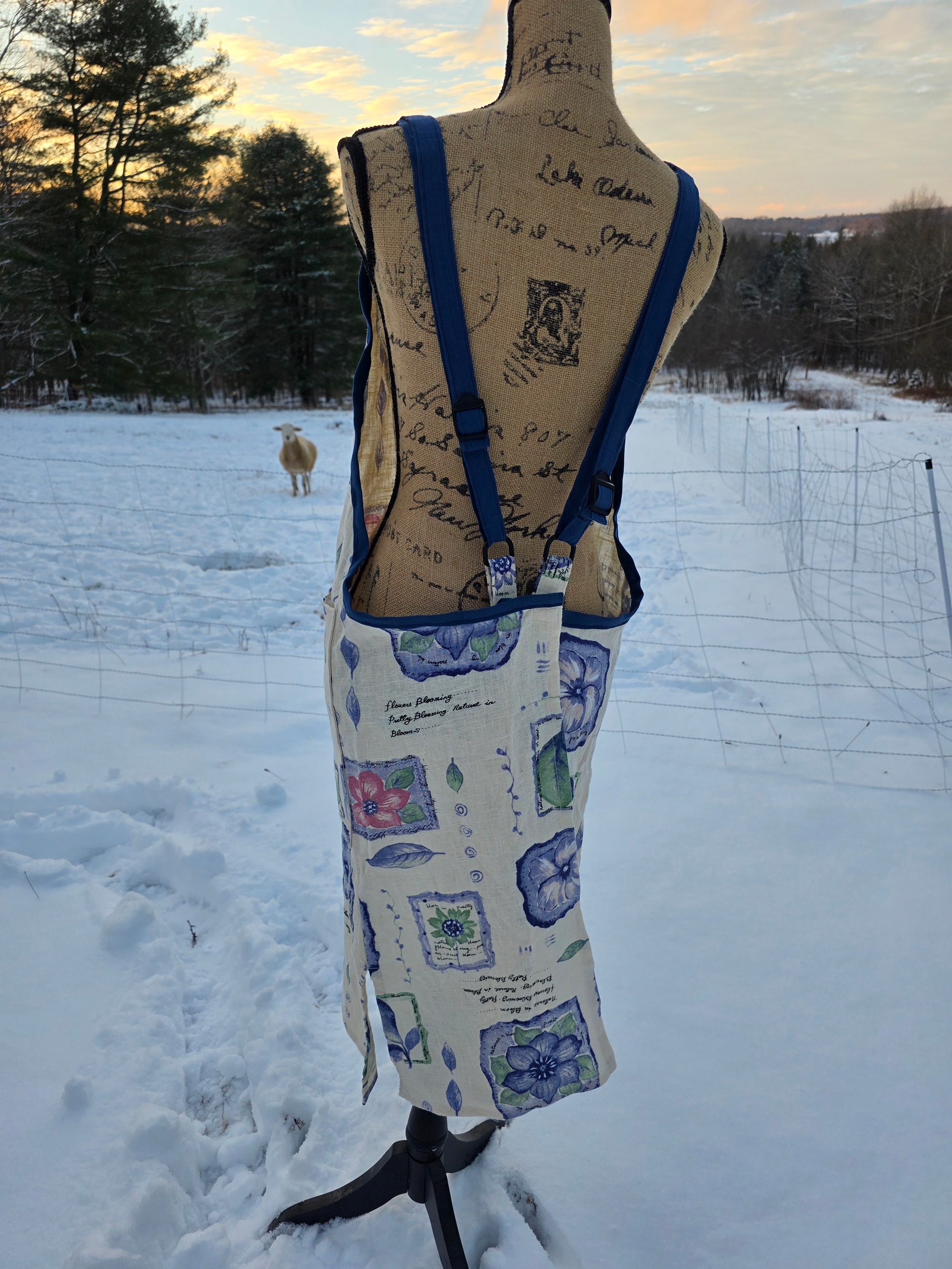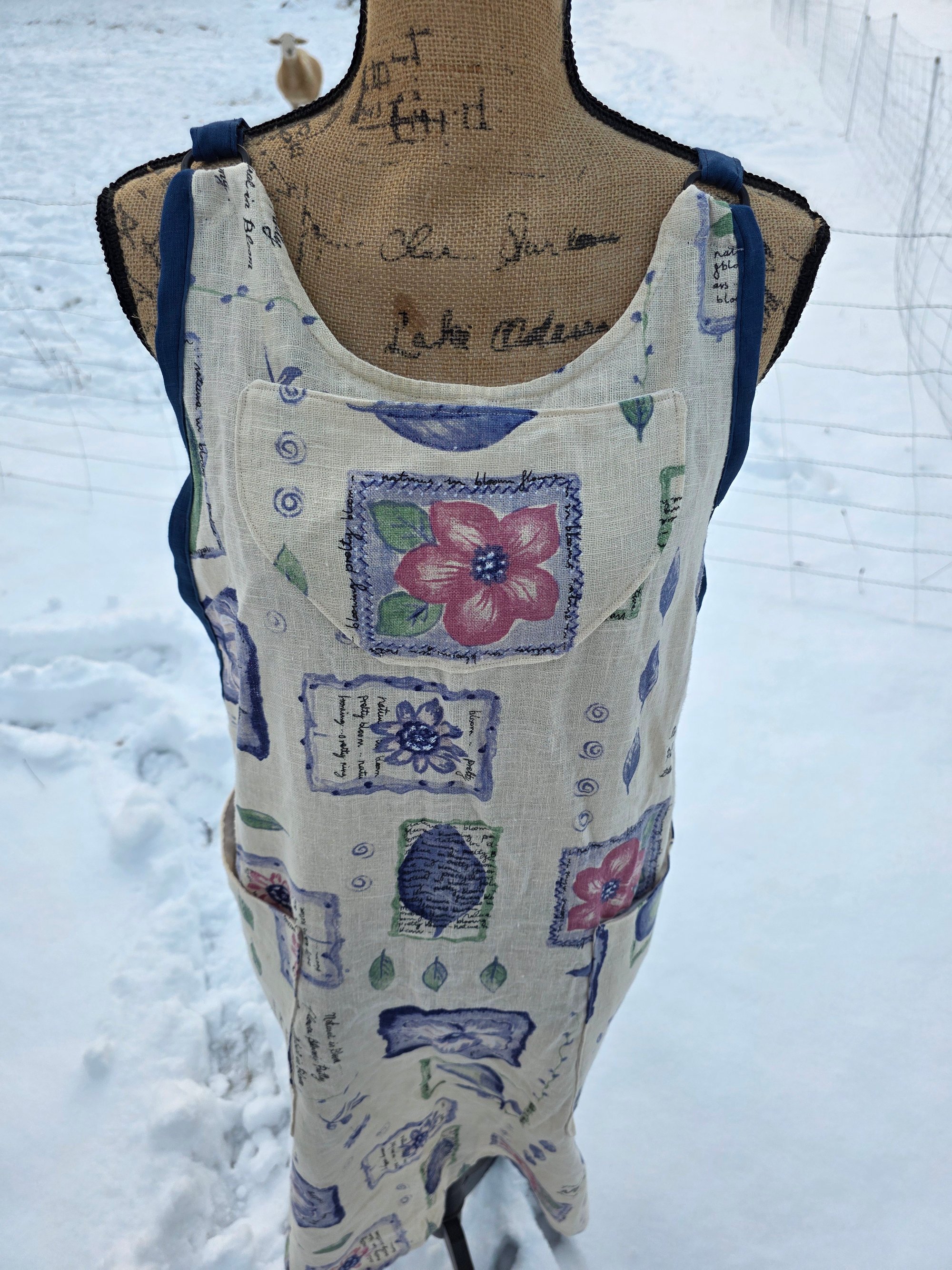 Made from a unique 100% linen dress, and all fabrics used are 100% linen as well. The botanical print on light cream features script writing with things such as "nature in bloom", "pretty blooms", etc. The trim and straps are navy blue linen, and the crossover back straps are adjustable with slides. Three nicely placed pockets. This apron best fits Small through XL.