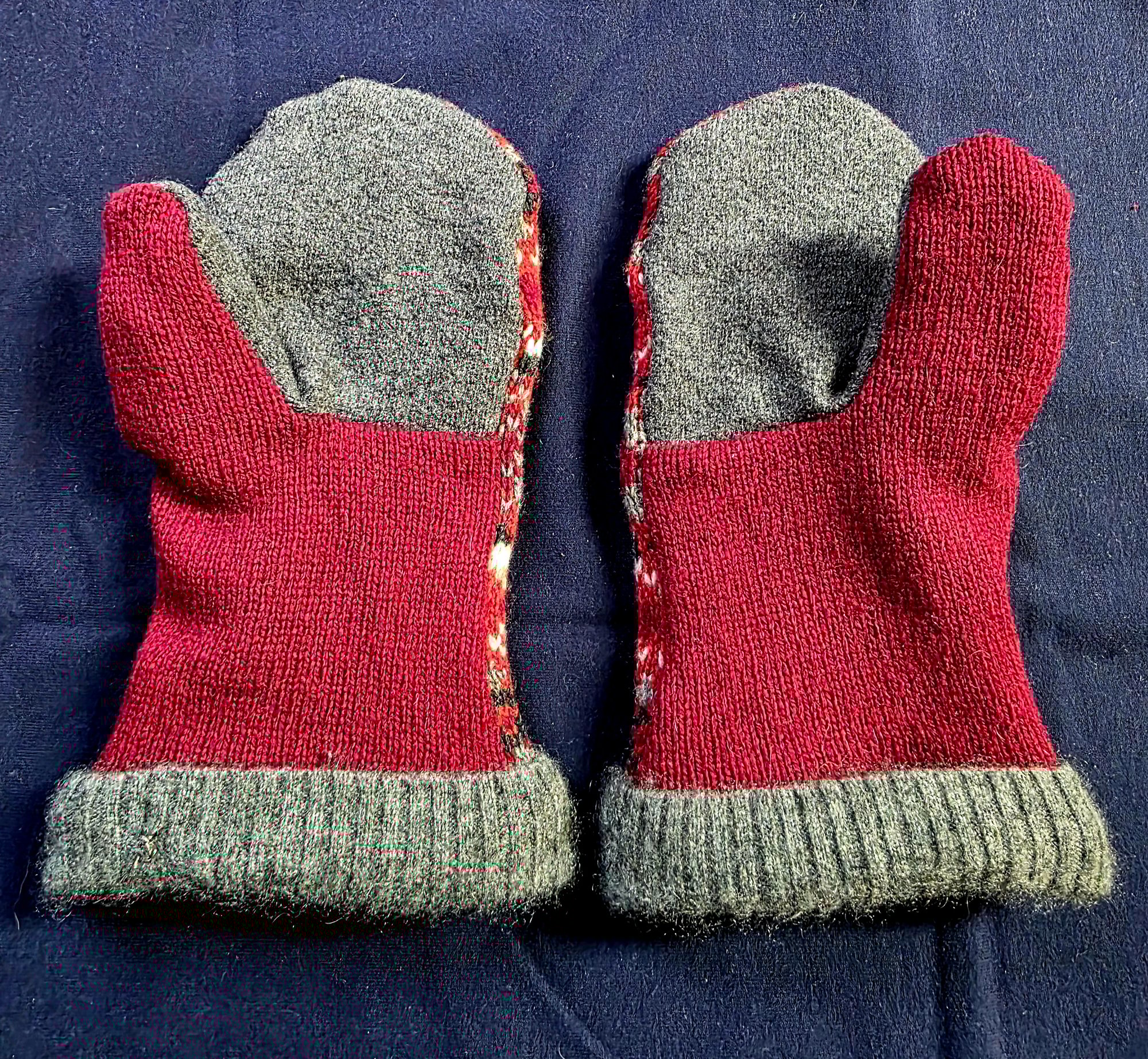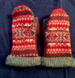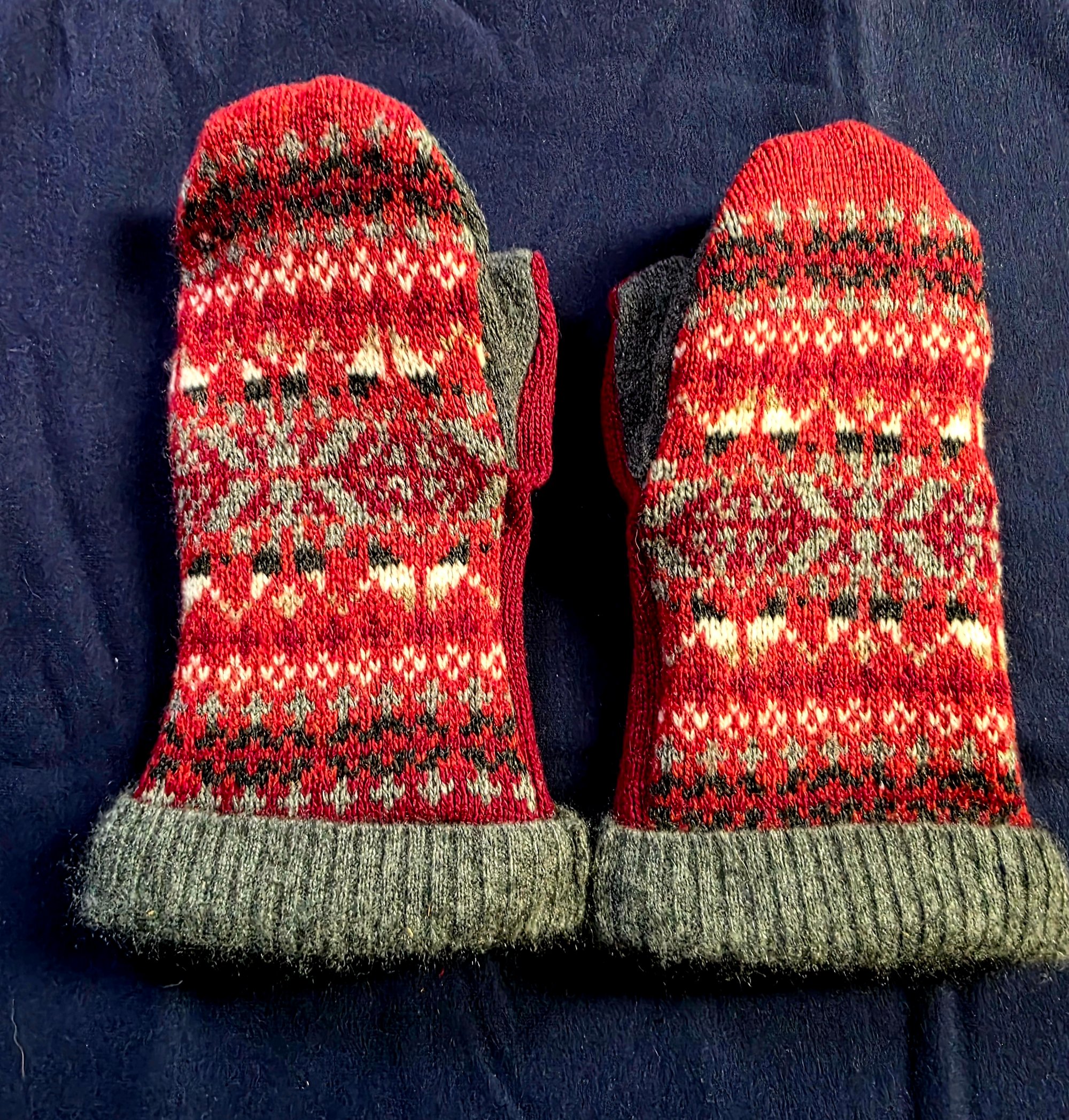 Upcycled Wool Adult Mittens S-M- Burgundy Fair Isle