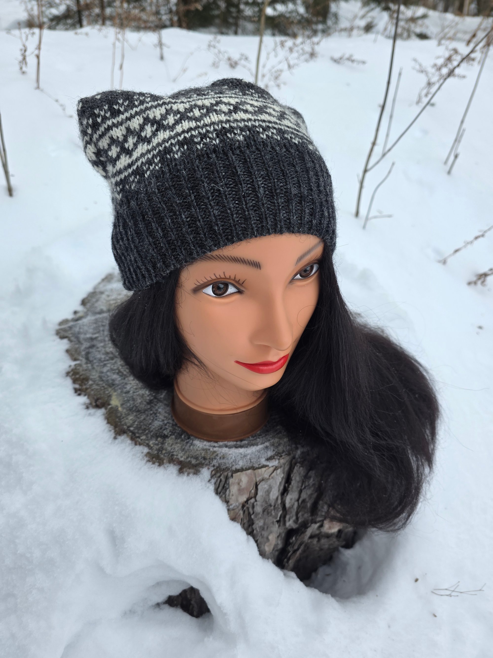 Upcycled Wool Fair Isle Charcoal Beanie in Youth/Adult Small