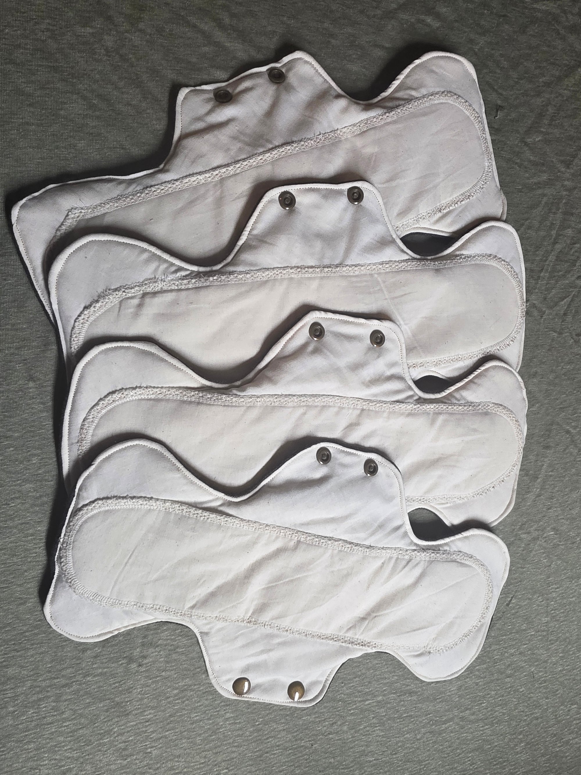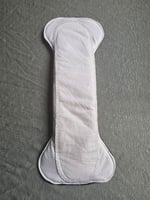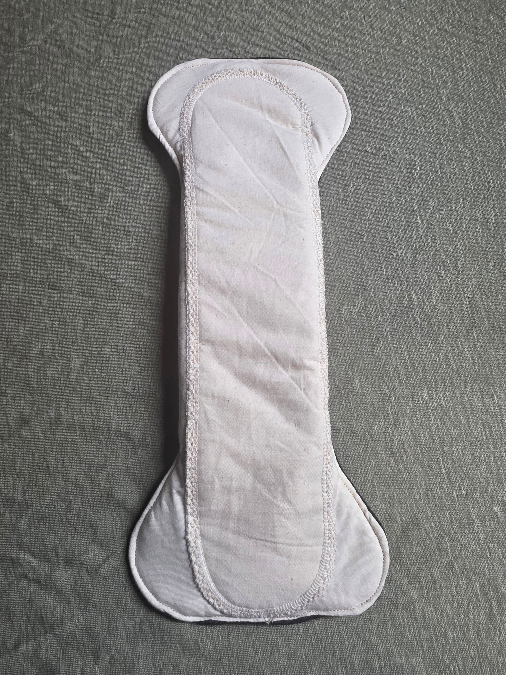The top facing fabric is 100% unbleached natural cotton, and the Absorbency layers are 100% natural cotton. The snaps are diaper grade plastic.