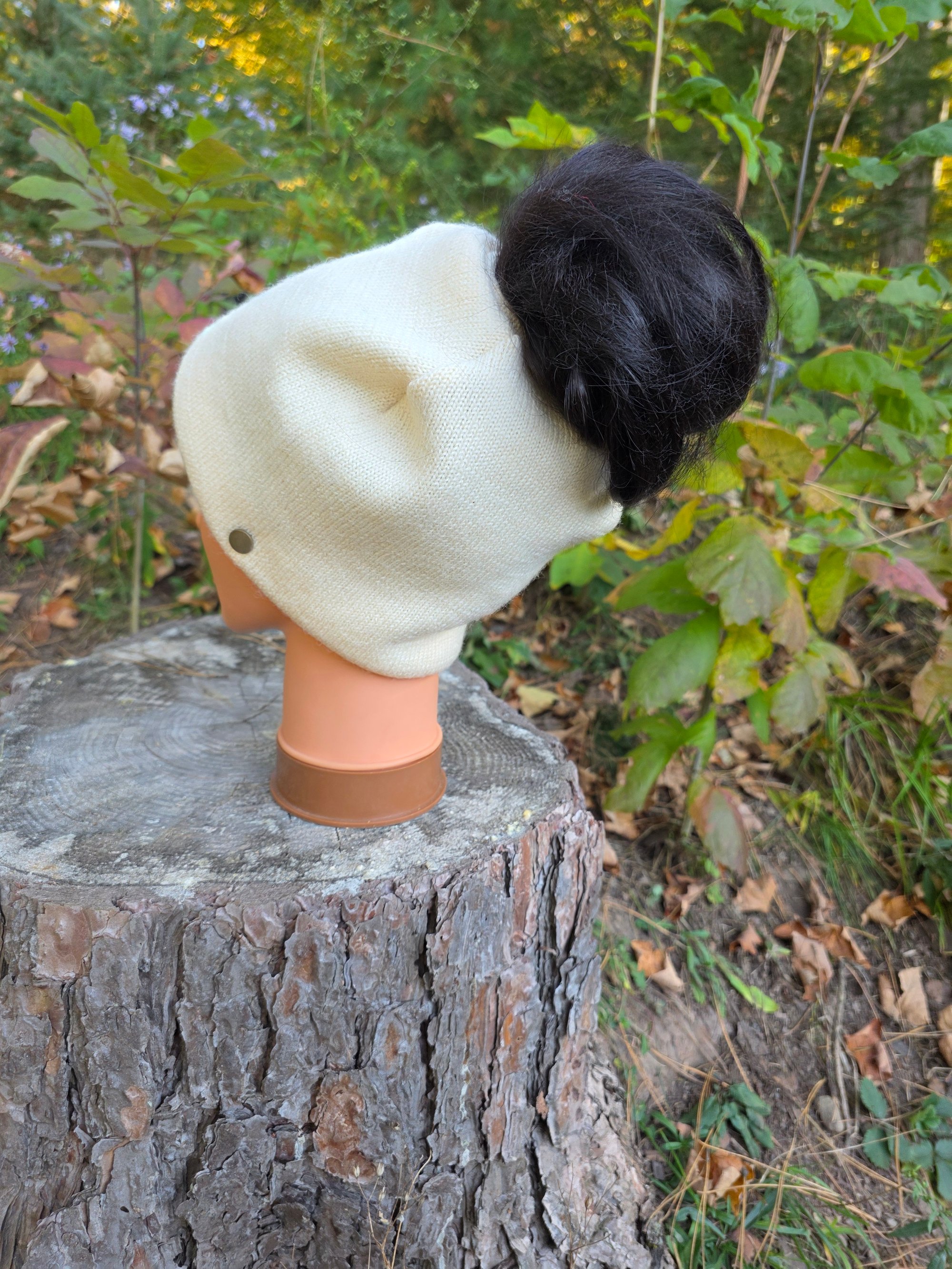 Made from an upcycled 100% wool sweater, this beanie features an elasticized hole in the top to pull your hair through, and two functional side snaps on the brim to help adjust thr style and fit. This hat best fits medium through XXL head sizes.
