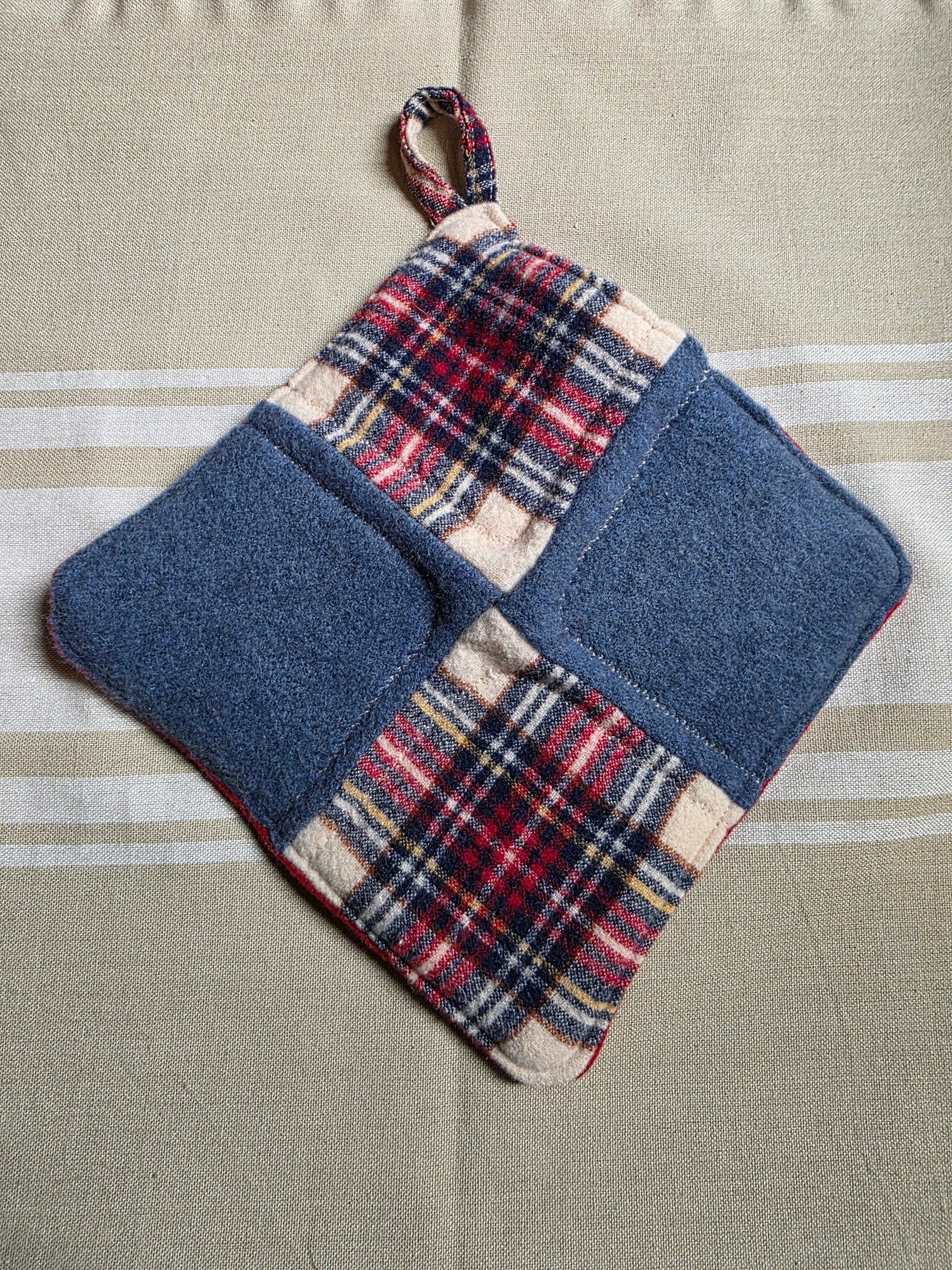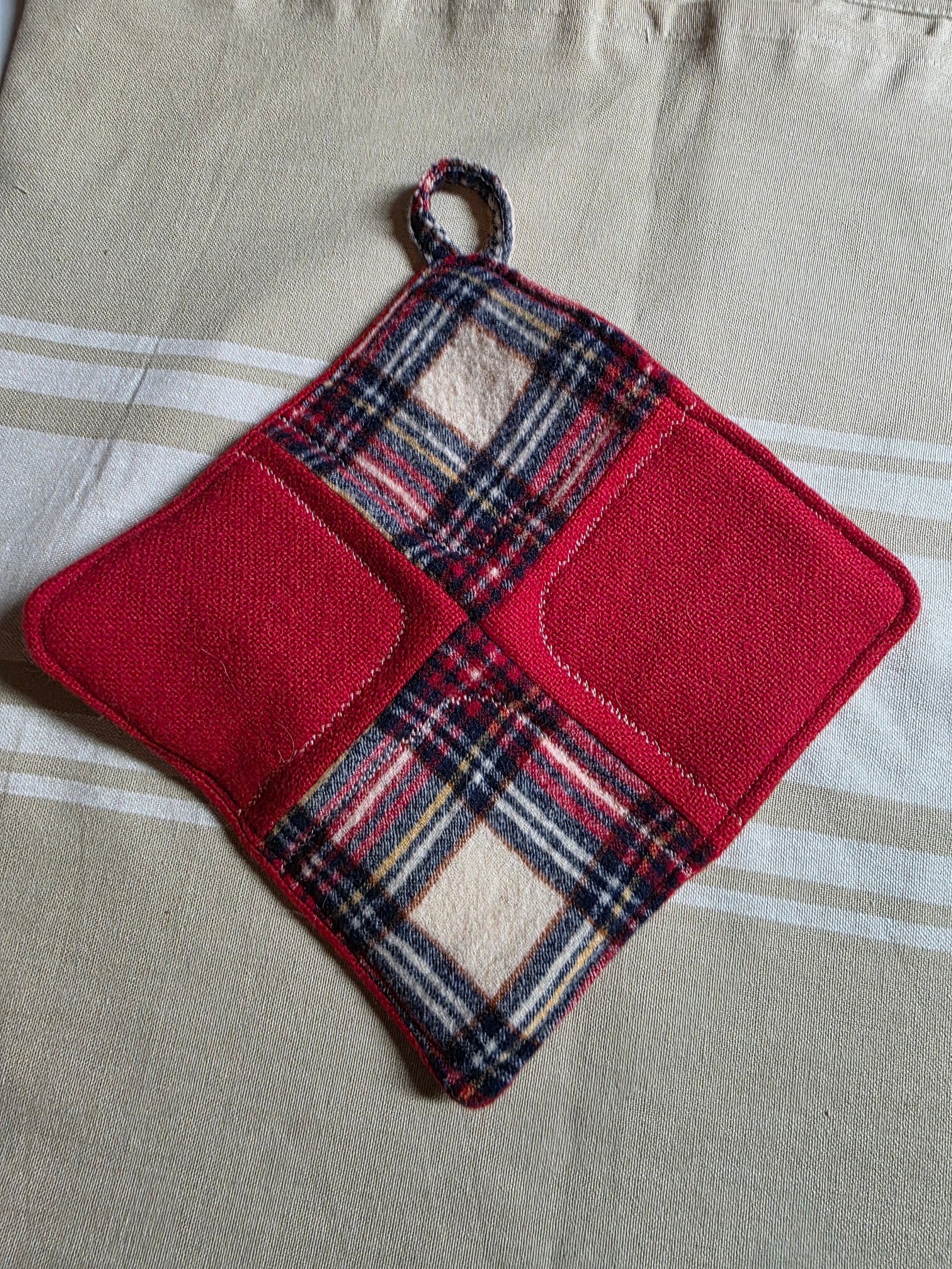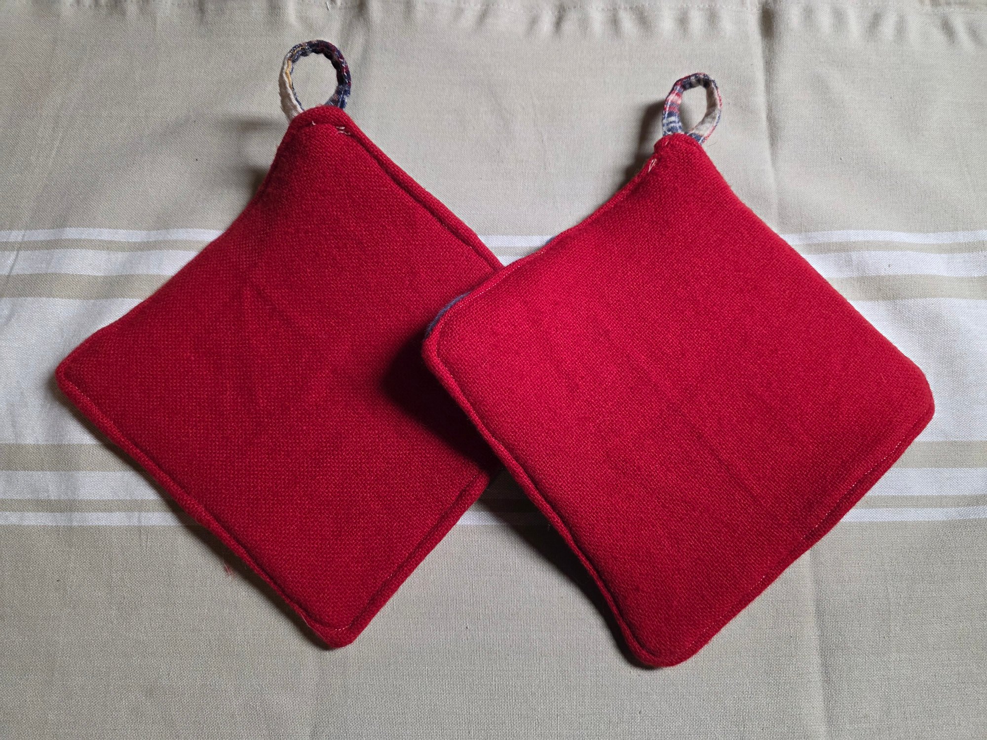 Made from upcycled 100% wool fabrics with multiple layers of 100% Natural Cotton batting in the center. 8" squares, set of 2.