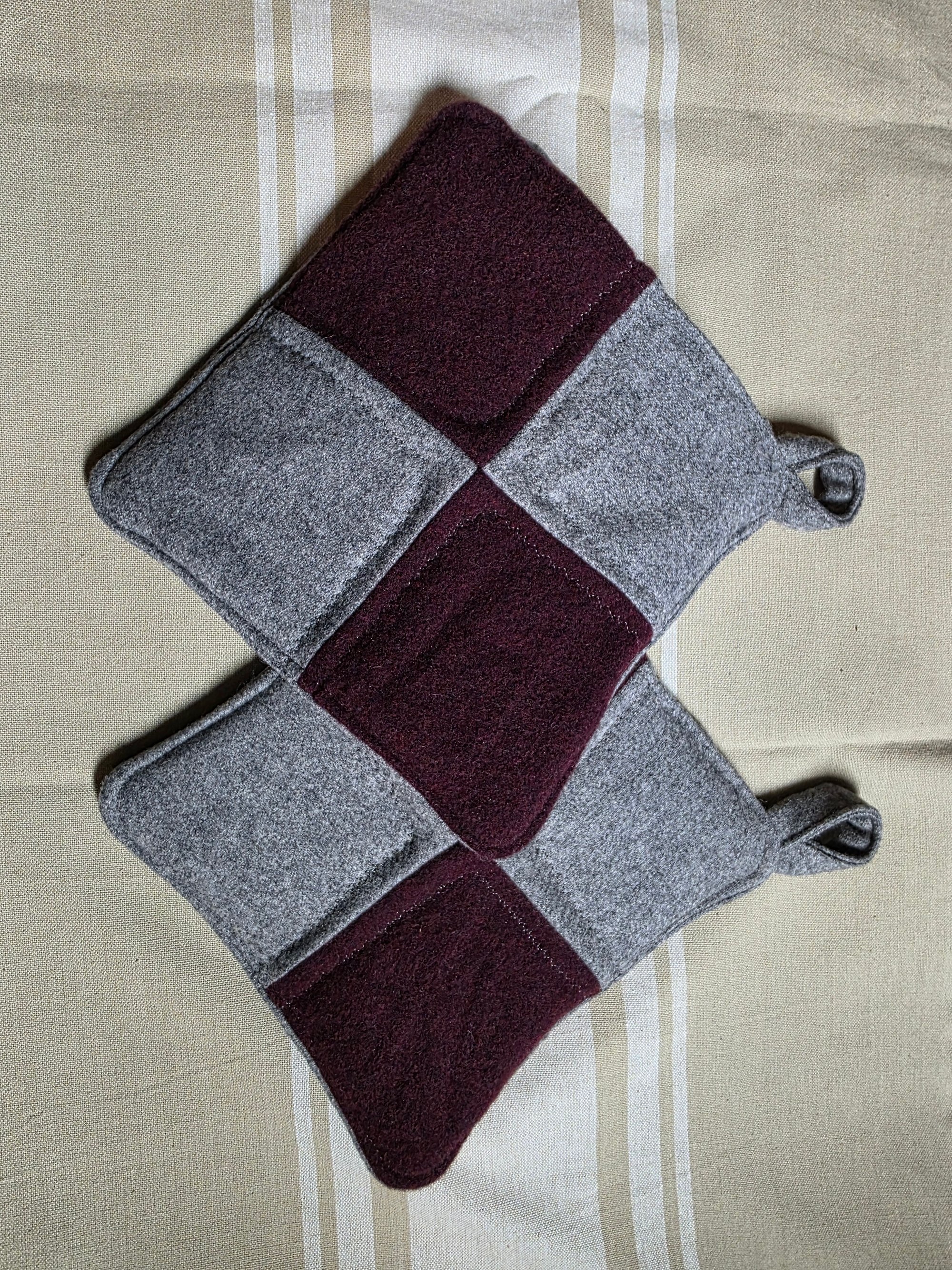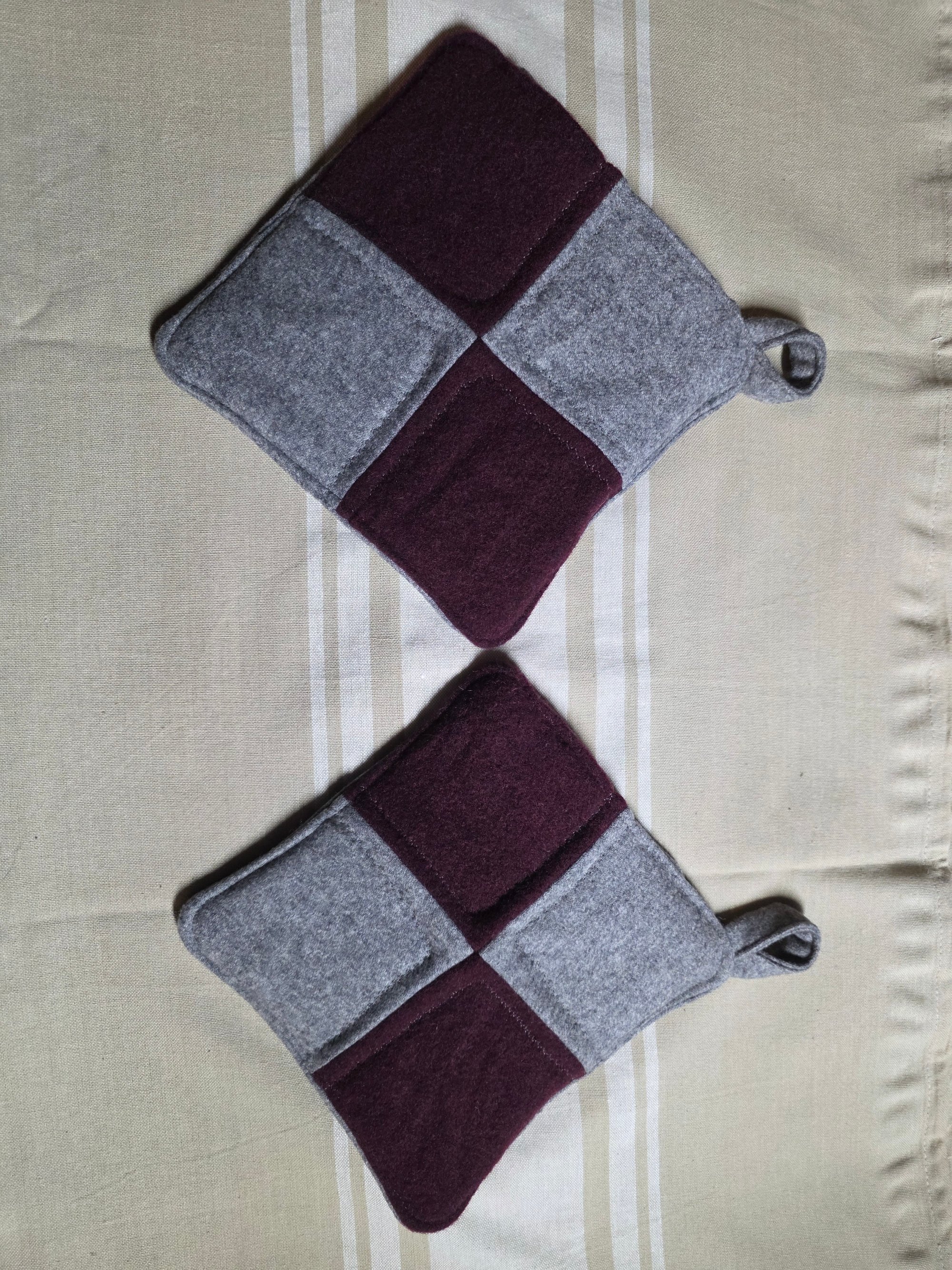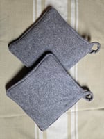 Made from upcycled 100% wool fabric, with multiple layers of 100% Natural Cotton Batting inside. 8" squares, set of 2.