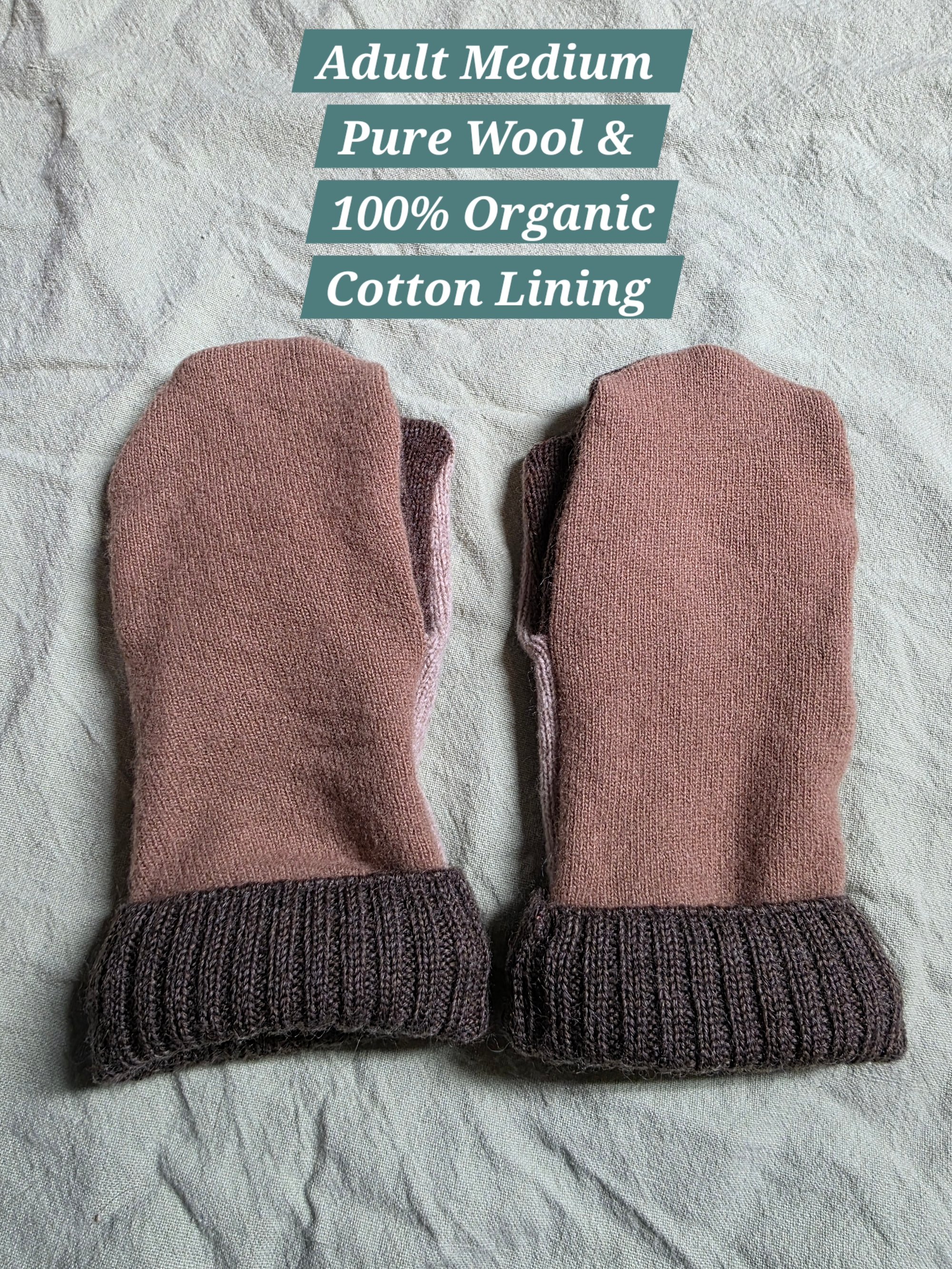 Made from up-cycled 100% wool sweaters, and lined with soft and stretchy 100% organic cotton. They measure 9.5" long and 4" wide across the hand.